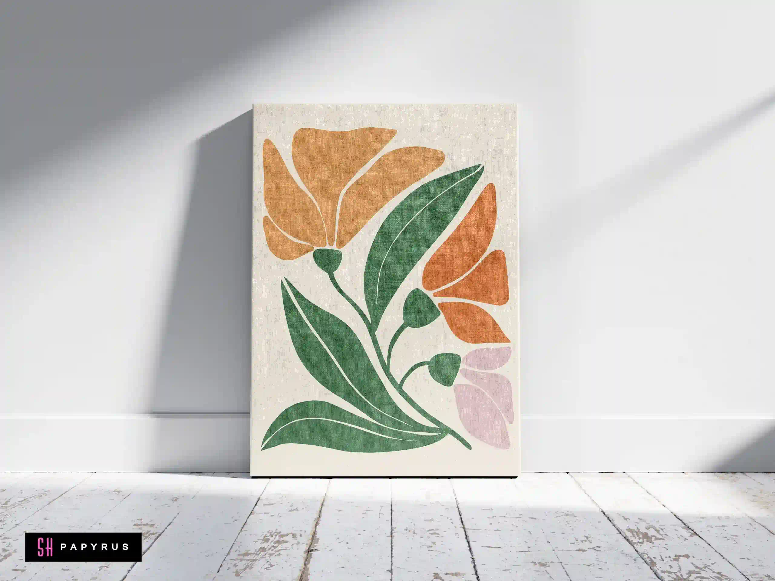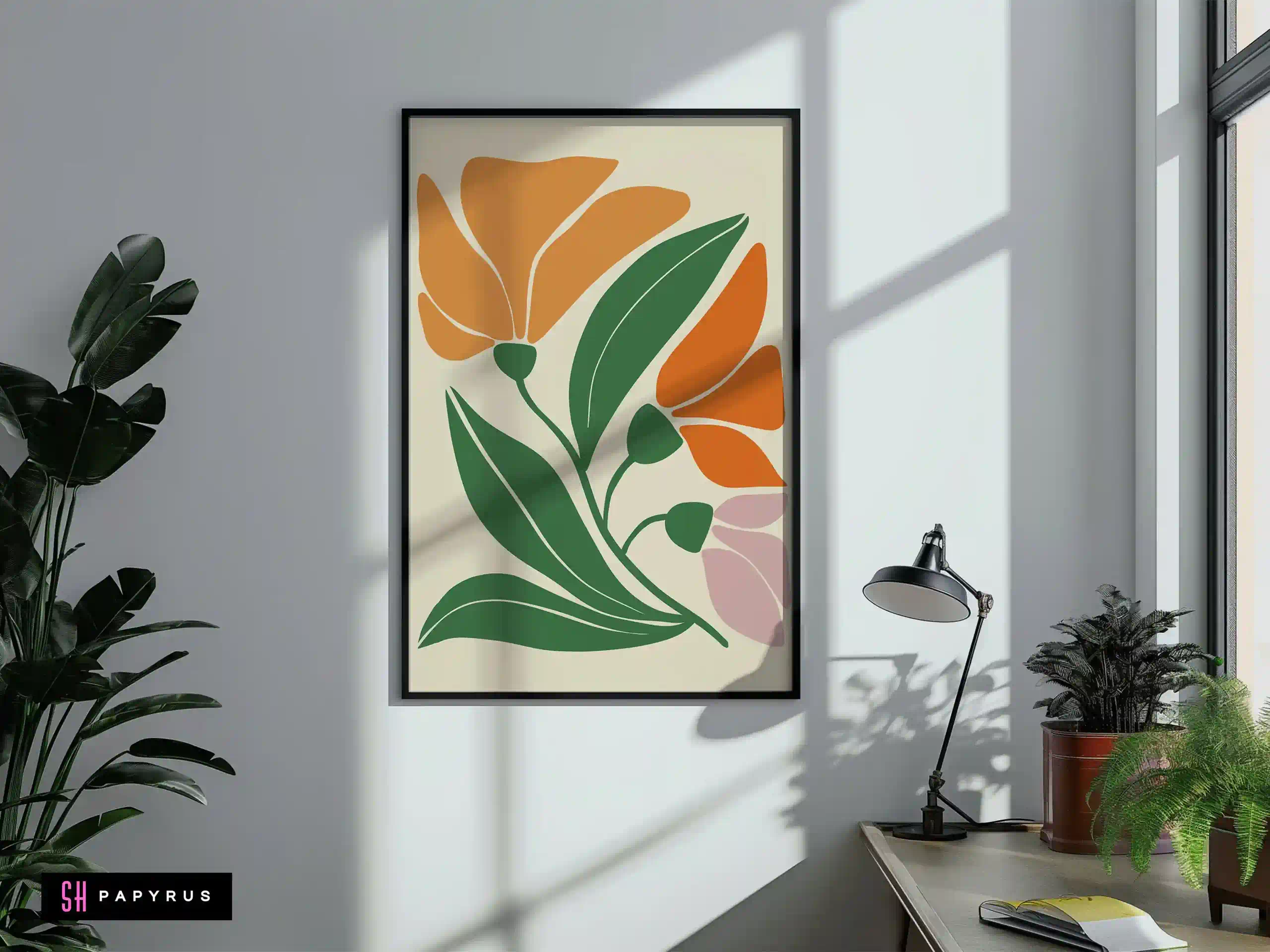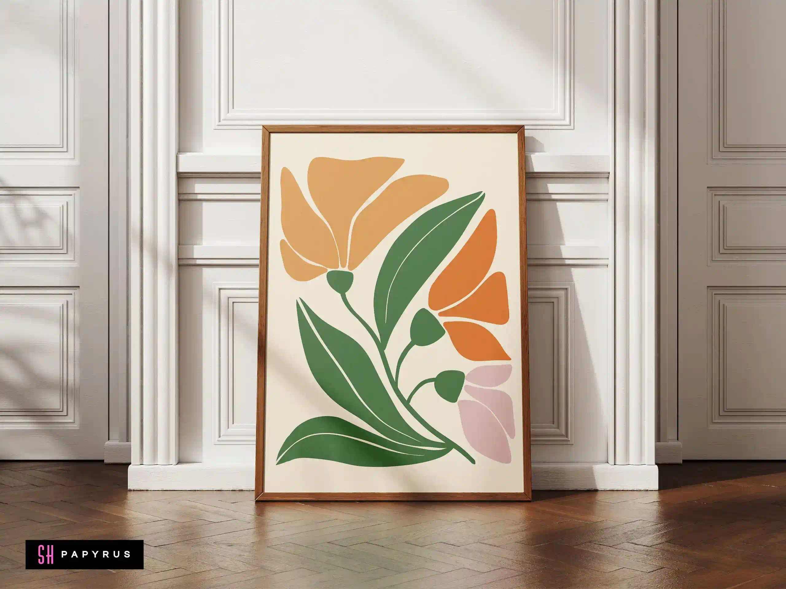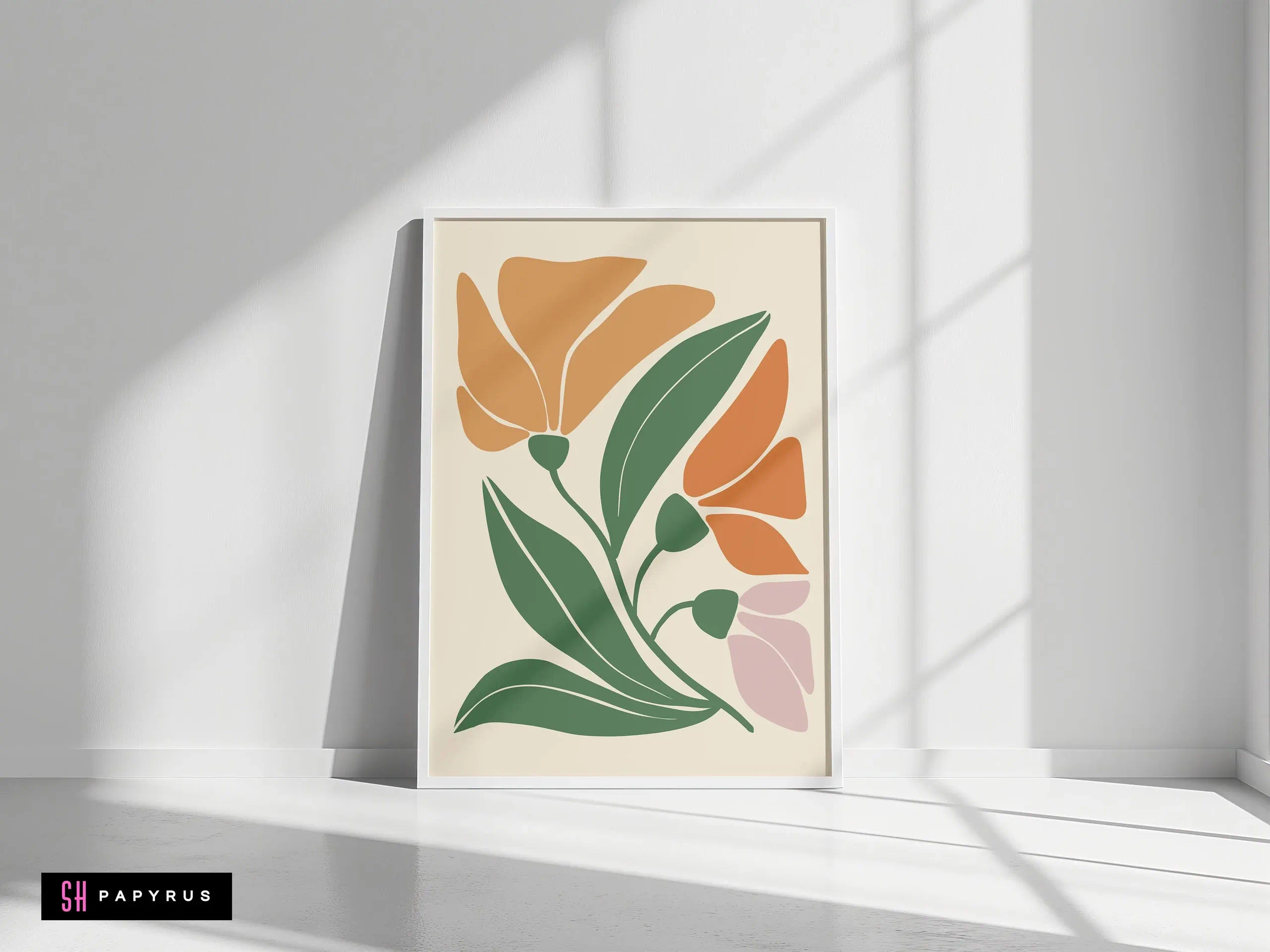 Looking for Charming Botanical Flowers? You’ll love this print, featuring a lovely spray of flowers in warm terracotta, soft orange, and delicate pink, with rich green leaves. It’s a gentle, modern piece that adds a soft, warm atmosphere to any room. The simple, stylized blooms have a contemporary, minimalist feel, but the color palette keeps it warm and inviting. This print is ideal for a bedroom, nursery, or any space where you want to create a calm and pretty environment. It’s a sweet, understated piece that adds a perfect touch of nature. You can get the artwork as a Digital File to print yourself, a heavyweight Giclee Poster (printed with museum-quality inks), a stretched Canvas, or a Framed Print in a beautiful metal or wood finish, arriving ready to display.