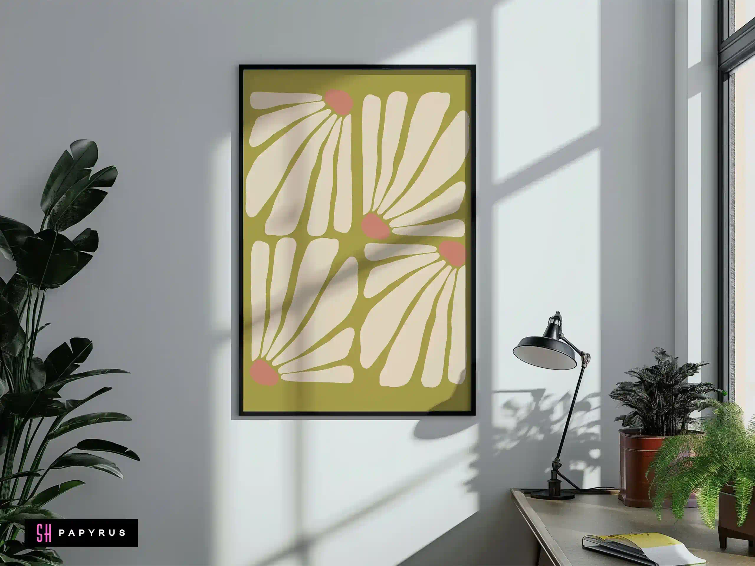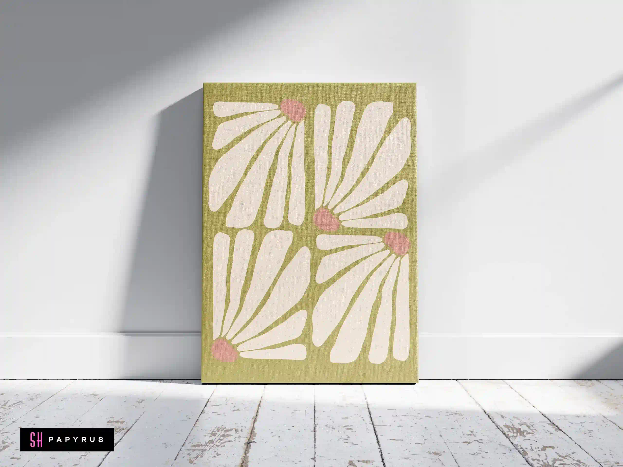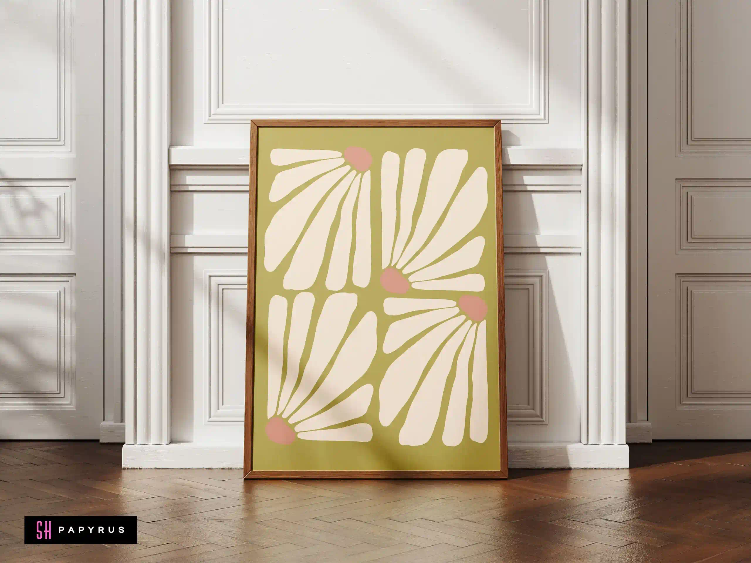 Add a Charming Retro Daisy Pattern in Cream & Olive to your wall! A sweet, ’70s-inspired design, it features four large daisies in cream-white with soft pink centers, all set on a lovely olive-green background. It’s a playful and gentle way to add retro charm. The soft, rounded shapes and the muted, earthy color palette give it a warm, nostalgic, and gentle feel. This print is perfect for a nursery, a kid’s room, a boho-style bedroom, or a kitchen. It’s a sweet, simple design that brings a touch of whimsy. Your new art is available as an instant Digital File, a premium Giclee Poster (on archival matte paper), a gallery-wrapped Canvas, or a professionally Framed Print in a metal or wood frame.