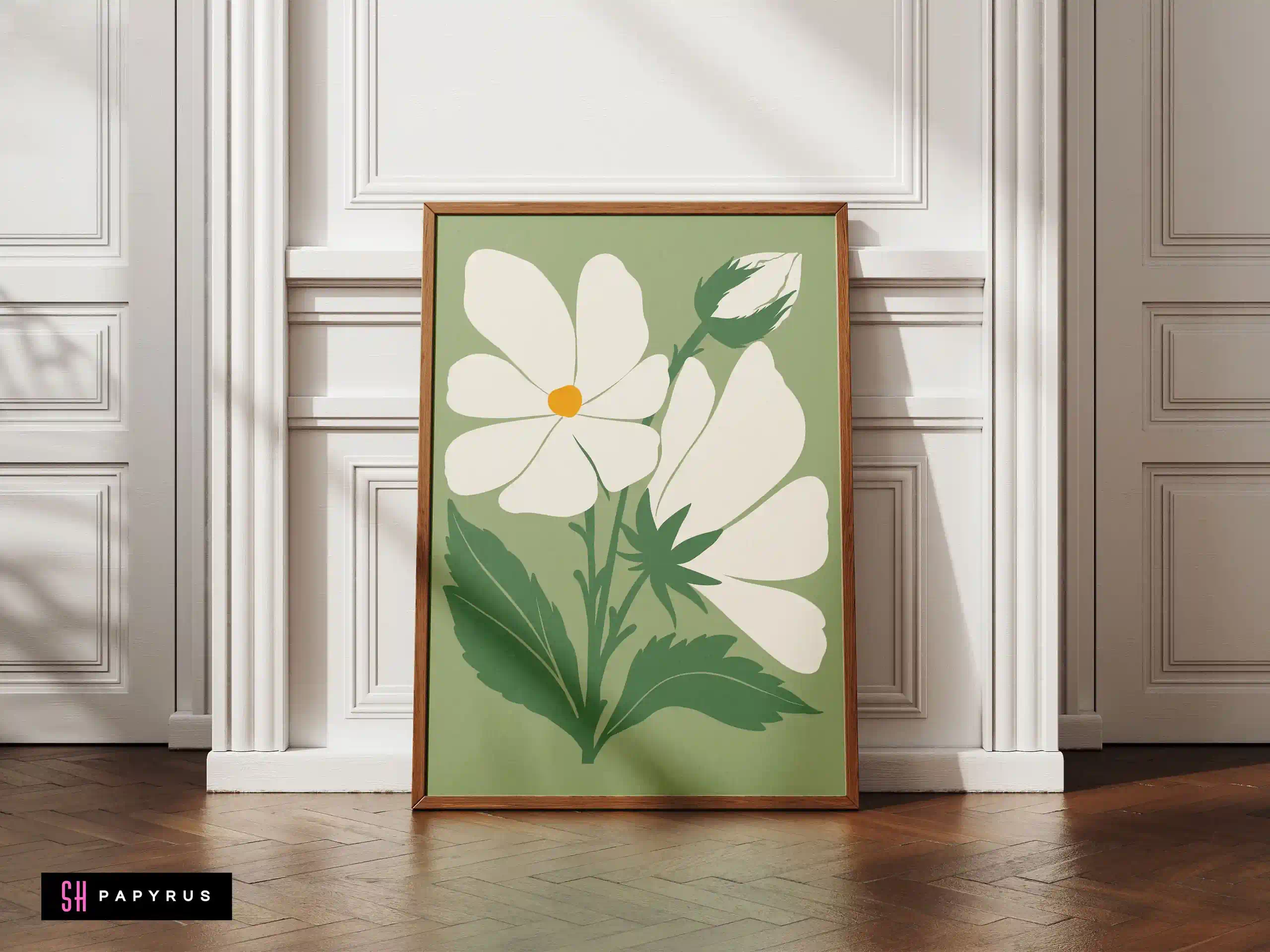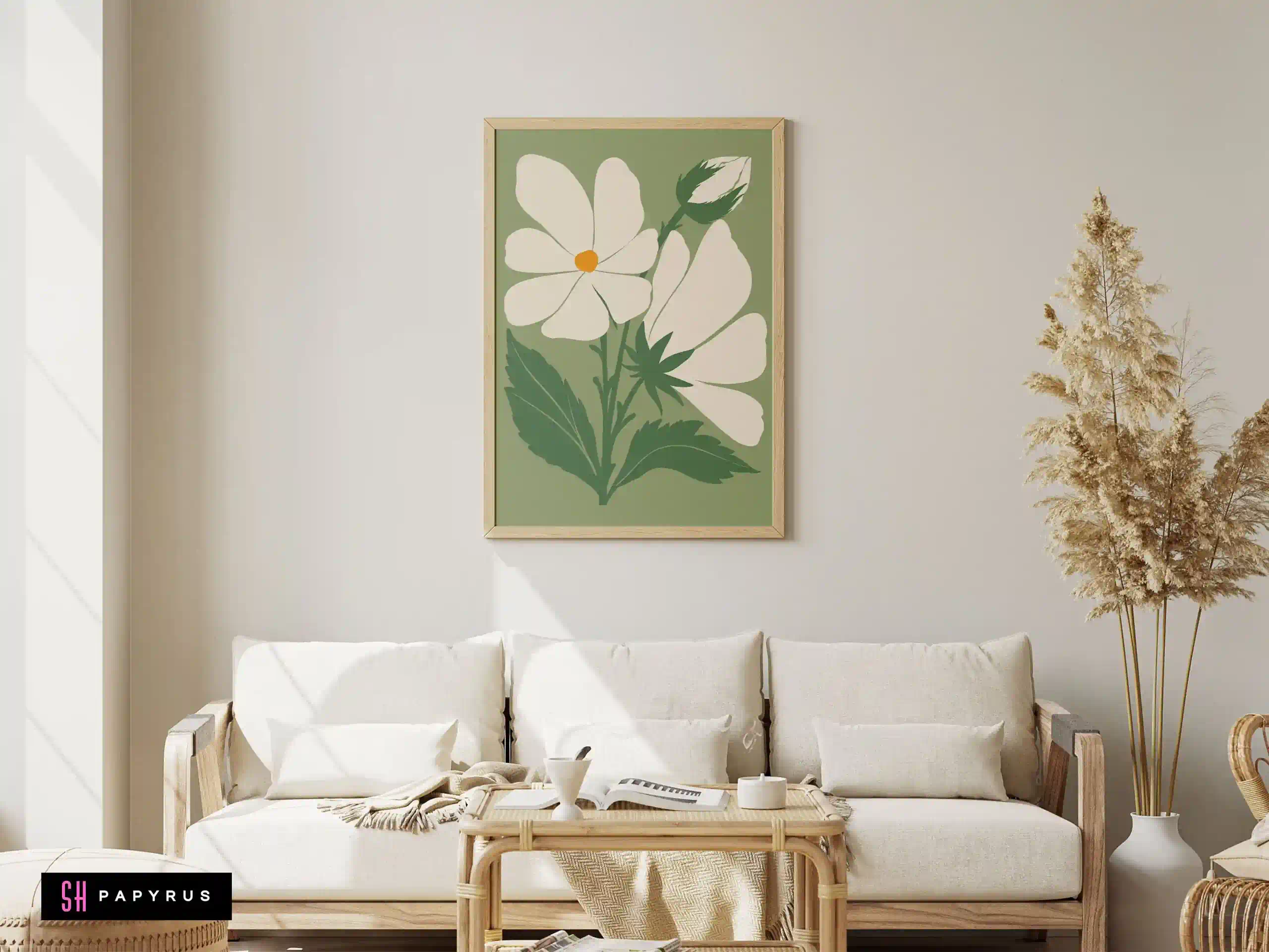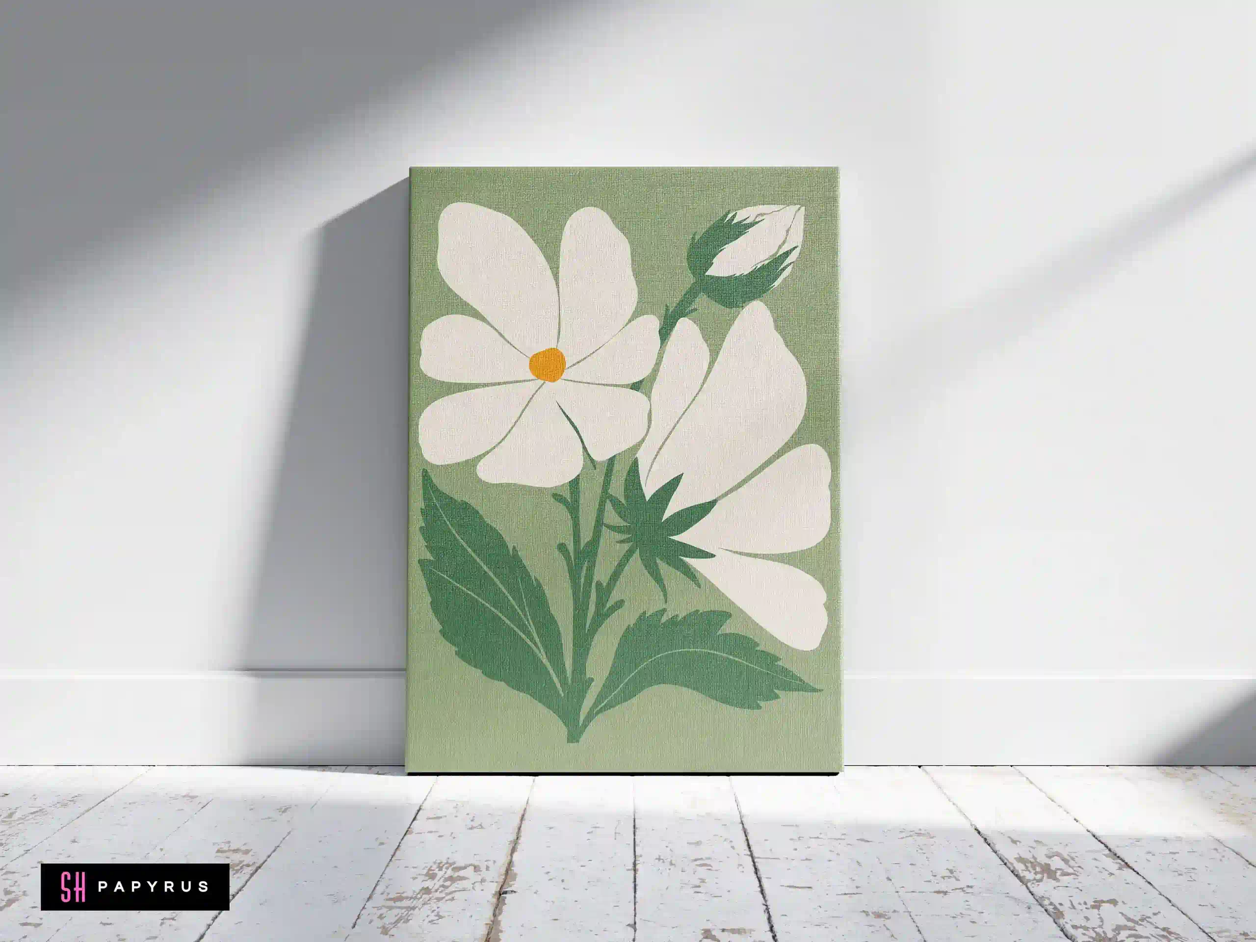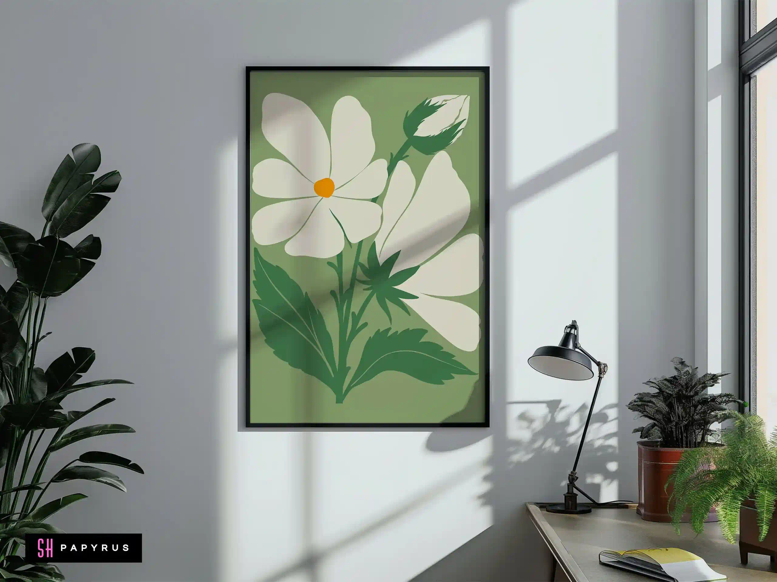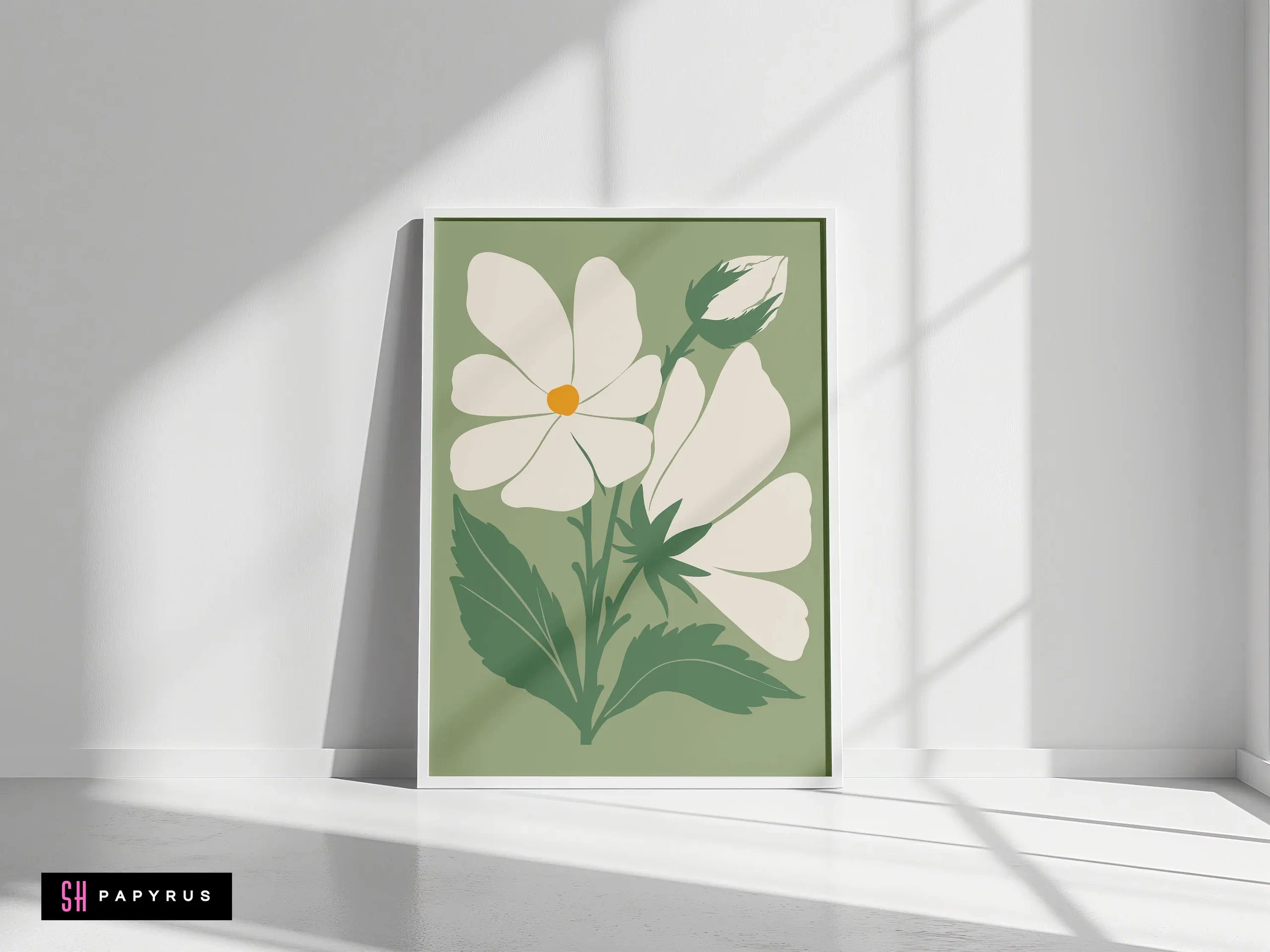 Enjoy Delicate White Cosmos Flowers on Sage Green Art. A fresh and charming botanical print, it features beautiful cream-white cosmos flowers and a bud against a calming sage green background. It’s perfect for adding a light, airy, and natural touch to your space. The composition is balanced and serene, and the simple color palette of white and green is timeless and relaxing. This print is ideal for a bathroom, a bedroom, a kitchen, or a modern farmhouse living room. It’s a wonderfully clean and peaceful piece. Your new piece is offered as a Digital File for instant download, a high-quality Giclee Poster (with fade-resistant inks), a gallery-wrapped Canvas, or a Framed Print in your choice of a metal or wood frame.