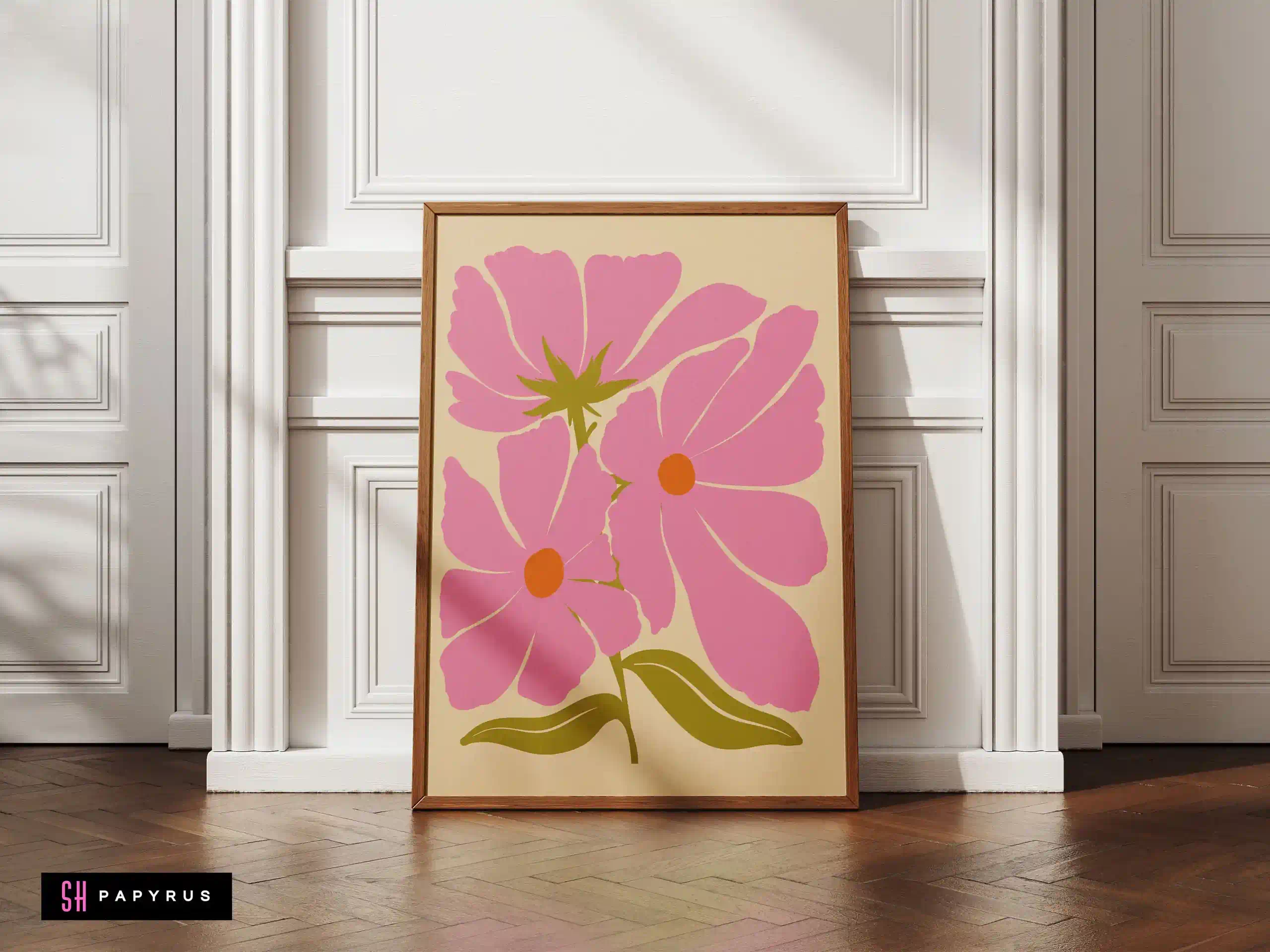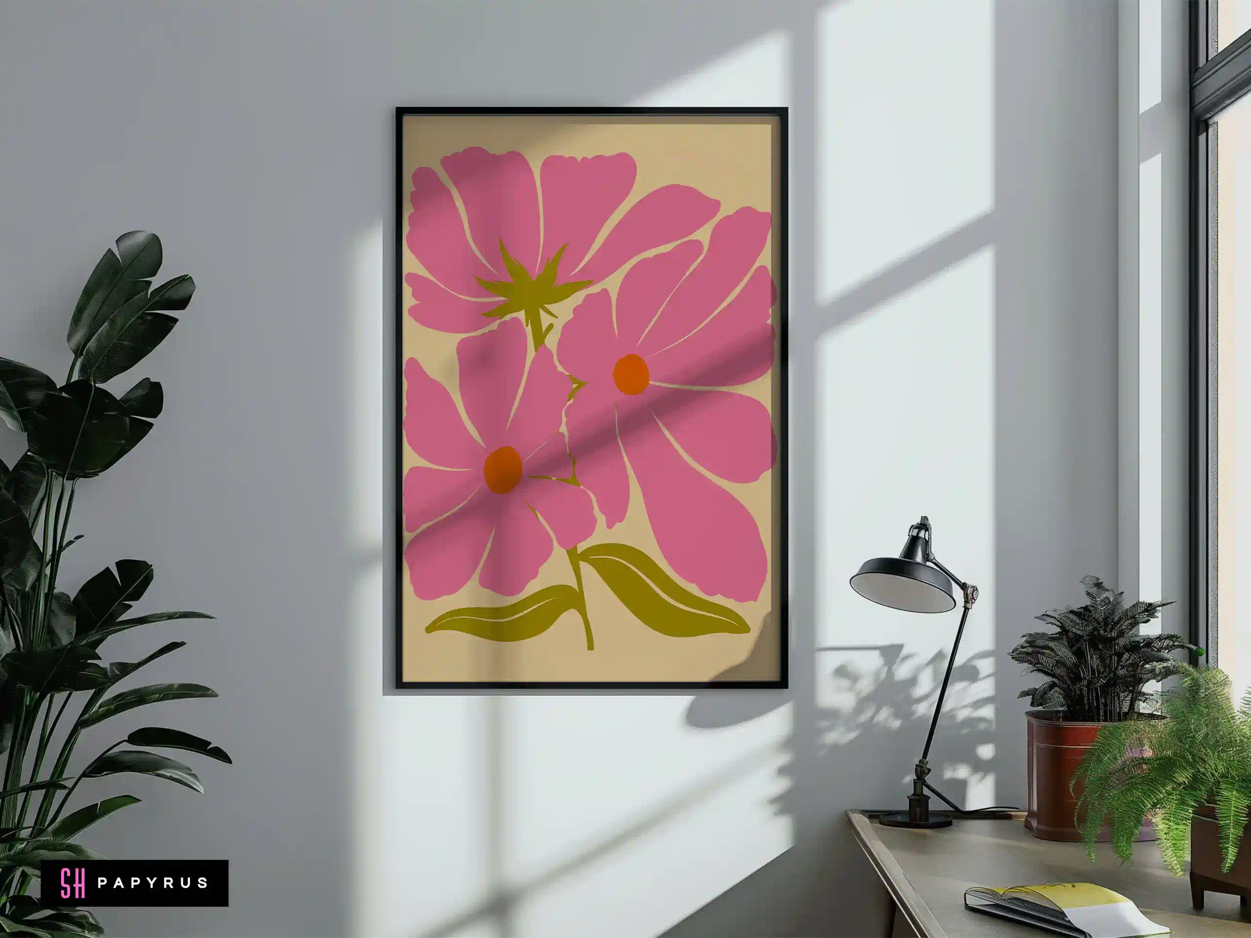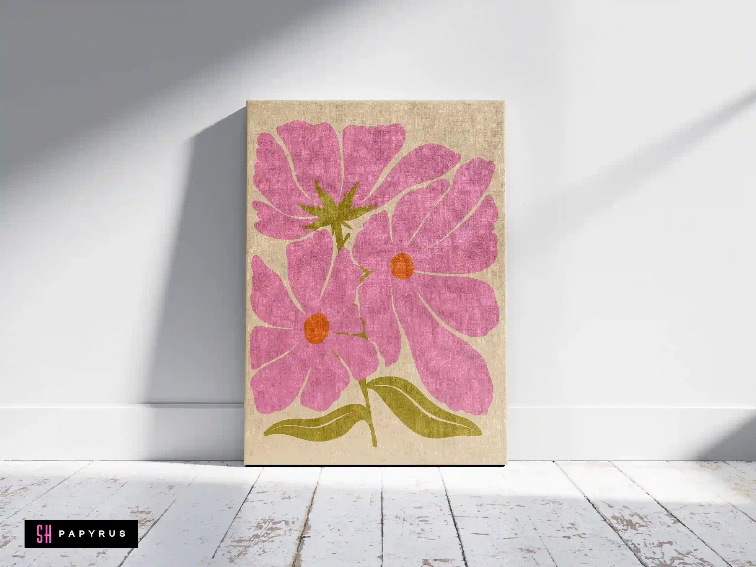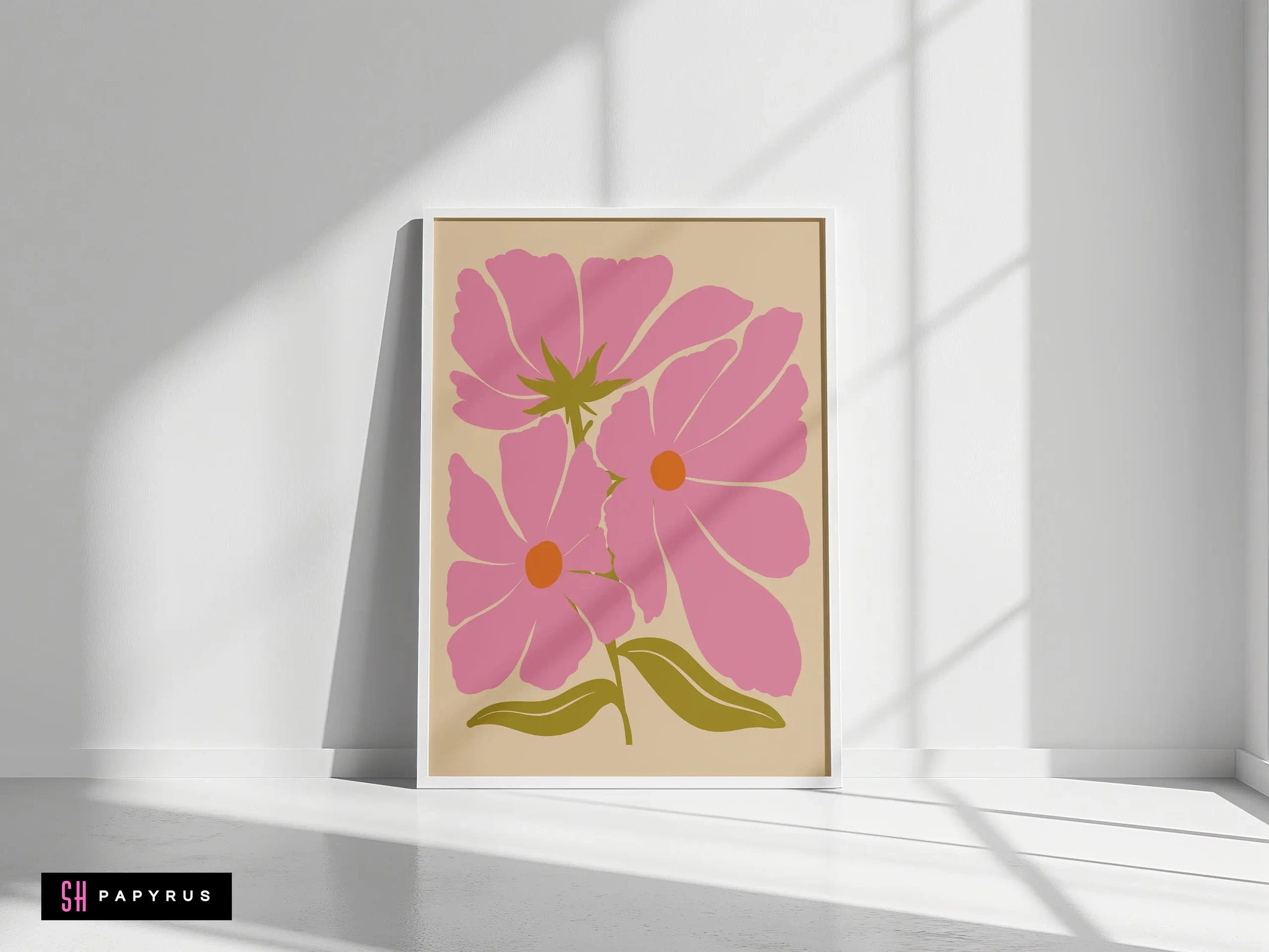 Brighten your room with a Joyful Pink Cosmos Flowers Boho Art Print! A wonderfully cheerful and charming piece, it features three large, bright pink cosmos flowers with orange centers on a warm, neutral tan background. It’s a simple, happy print that adds a lovely boho feel and a pop of color. The minimalist style of the flowers keeps it modern and fresh. This is an ideal print for a bedroom, a nursery, a living room, or as part of a gallery wall to add a soft, feminine, and joyful touch. It’s a beautifully simple and uplifting piece. Your new piece is offered as a Digital File for instant download, a high-quality Giclee Poster (printed on archival, acid-free paper), a gallery-wrapped Canvas, or a Framed Print in your choice of a metal or wood frame.