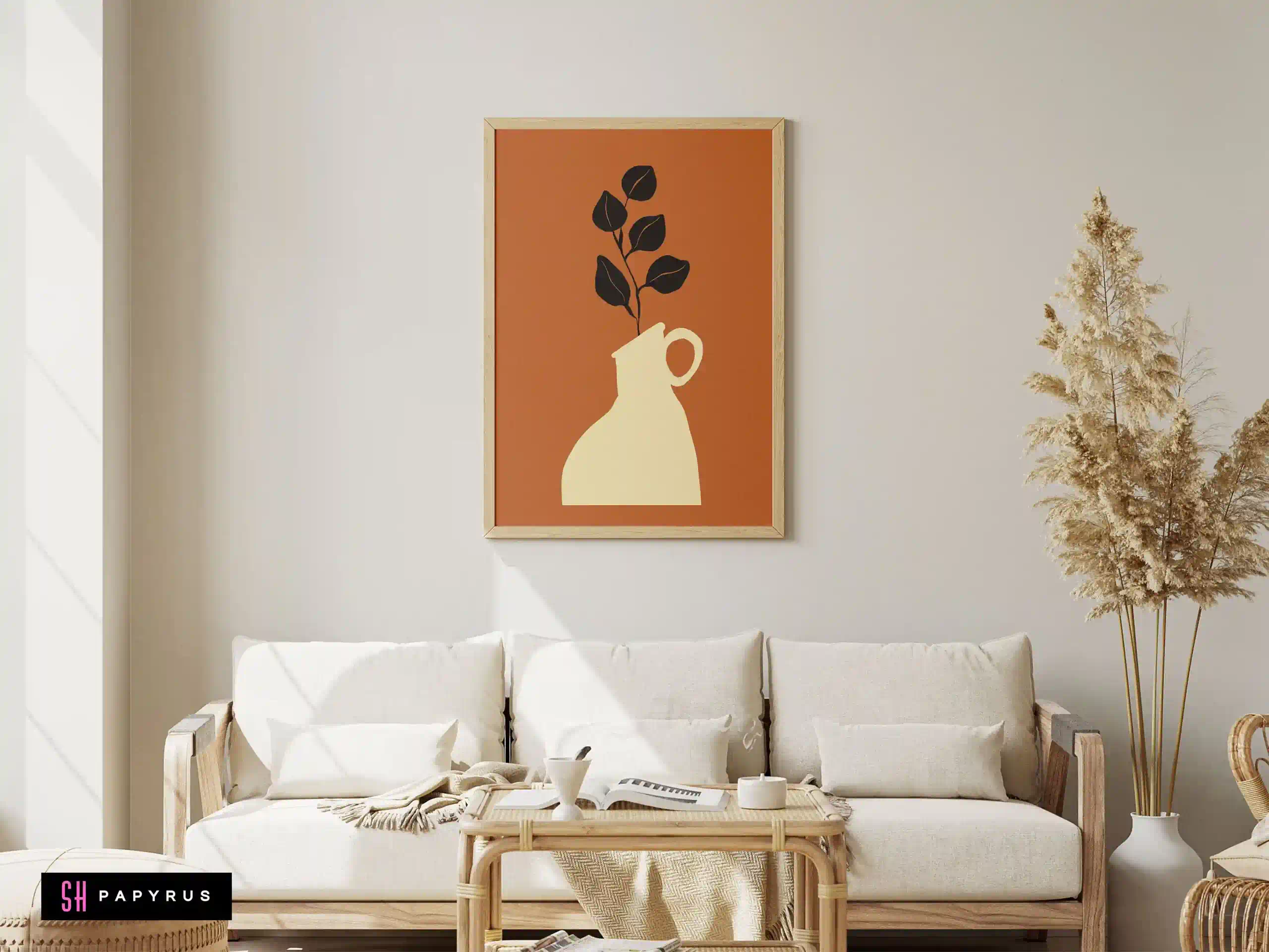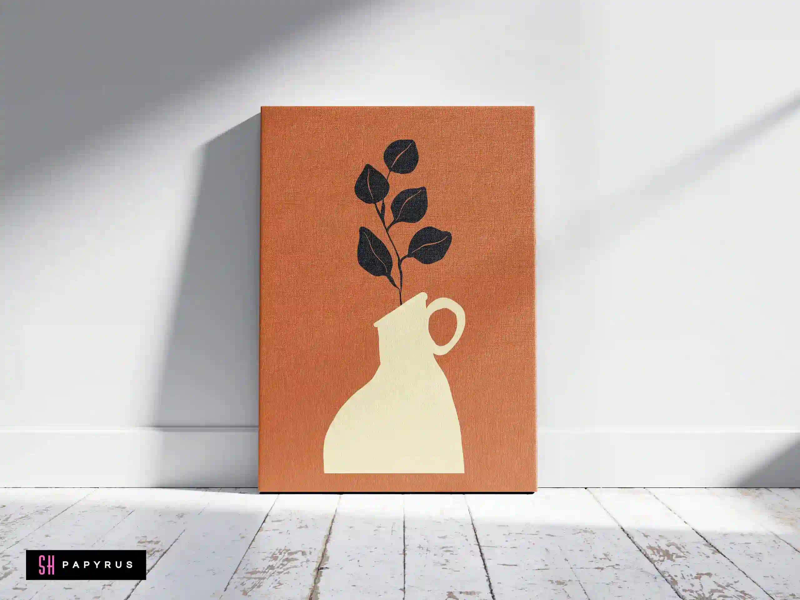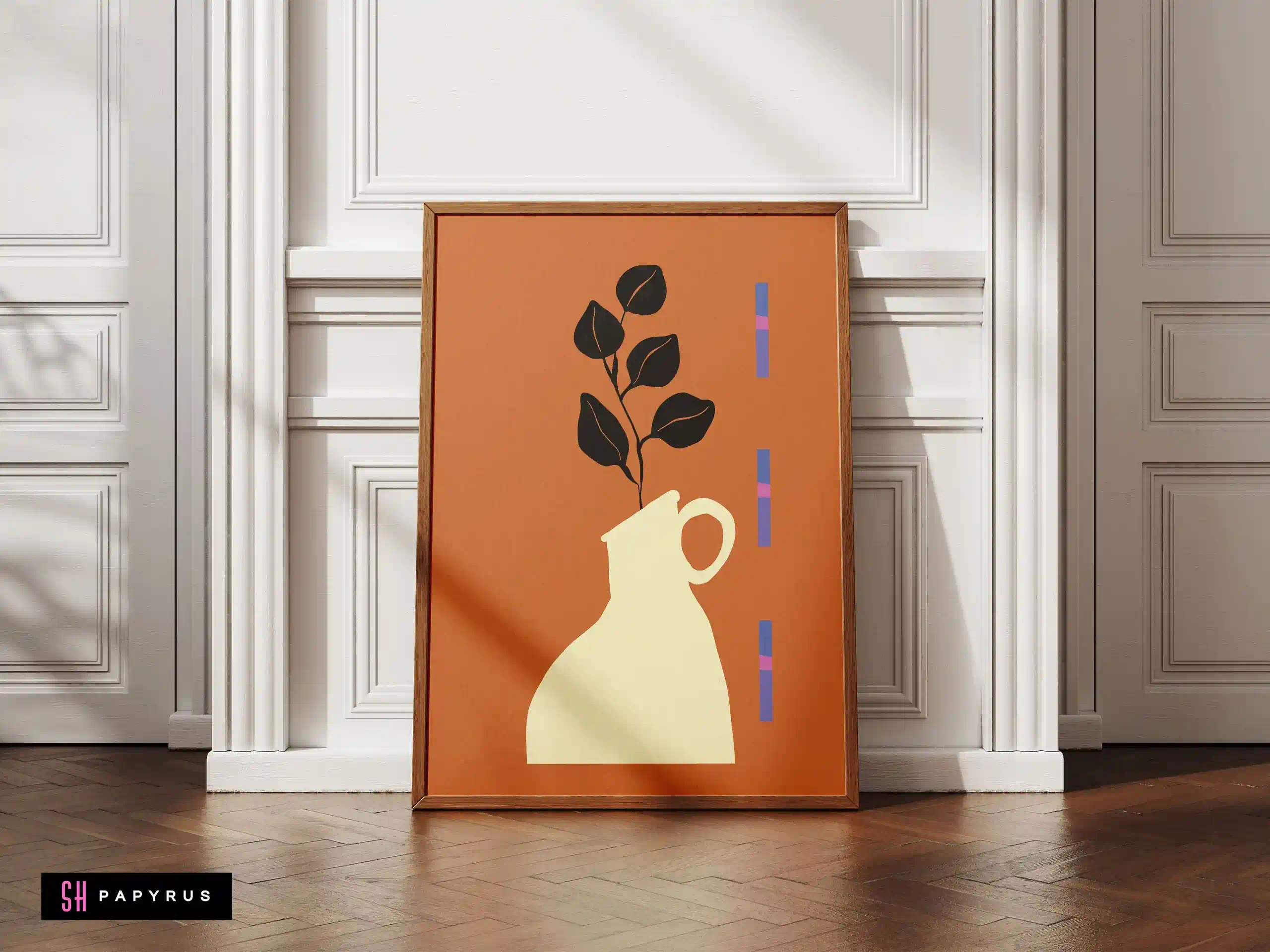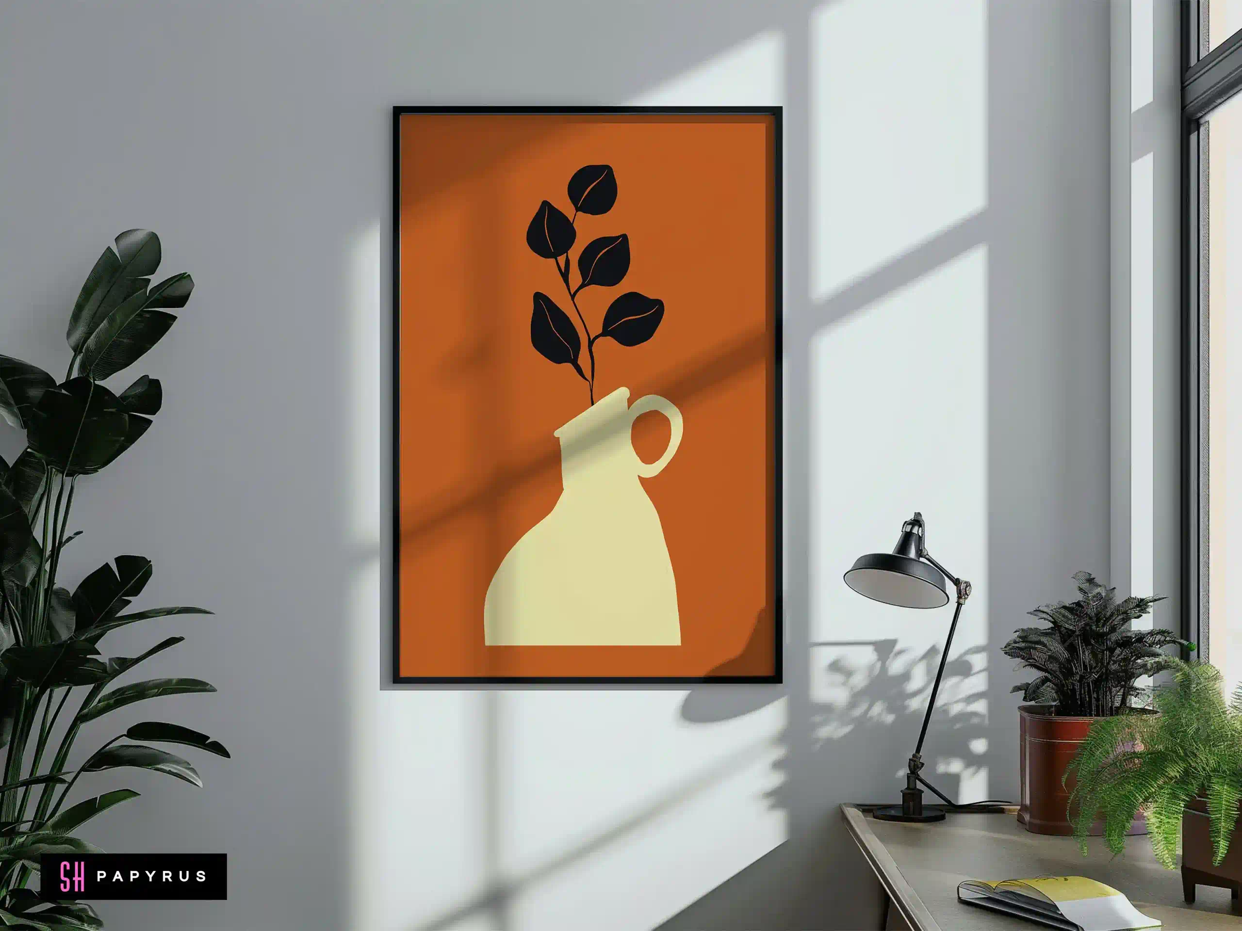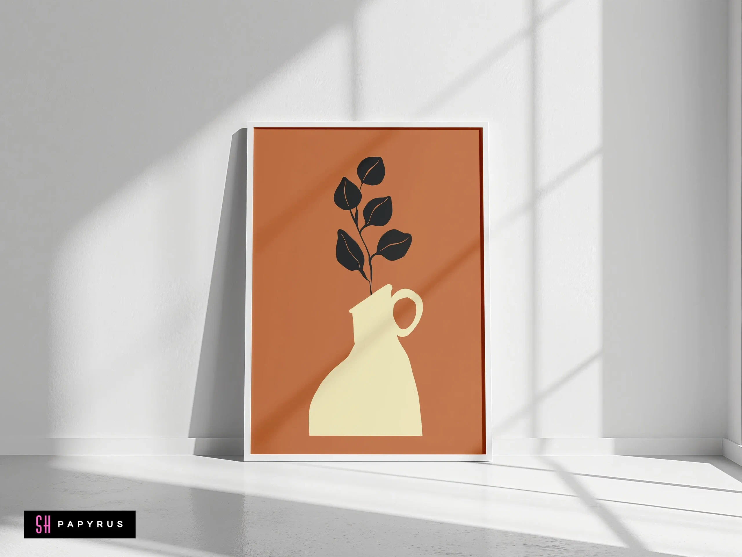 Make a bold statement with a Striking Black Leaves in Cream Pitcher Art Print. A modern, high-contrast masterpiece, it features a black eucalyptus branch silhouette in a simple, cream-white pitcher, all set against a deep terracotta-orange background. It’s a chic, minimalist, and powerful piece. The simplicity of the forms and the bold, warm color palette create a stunning visual impact. This print is perfect for a modern, boho, or farmhouse-style kitchen, dining room, or living area. It’s sophisticated and beautifully balanced. You can get the artwork as a Digital File to print yourself, a heavyweight Giclee Poster (with deep, saturated colors on archival paper), a stretched Canvas, or a Framed Print in a beautiful metal or wood finish.