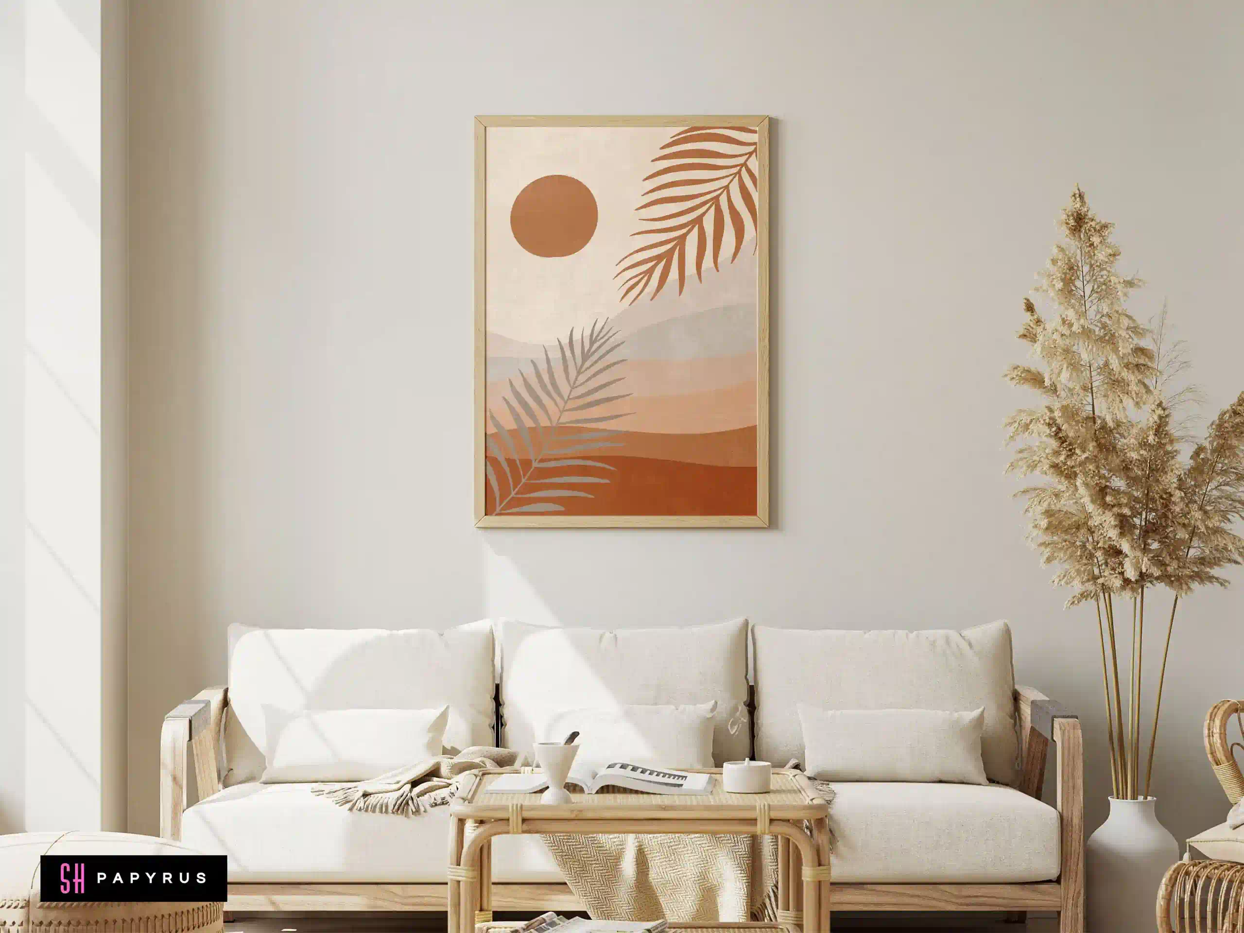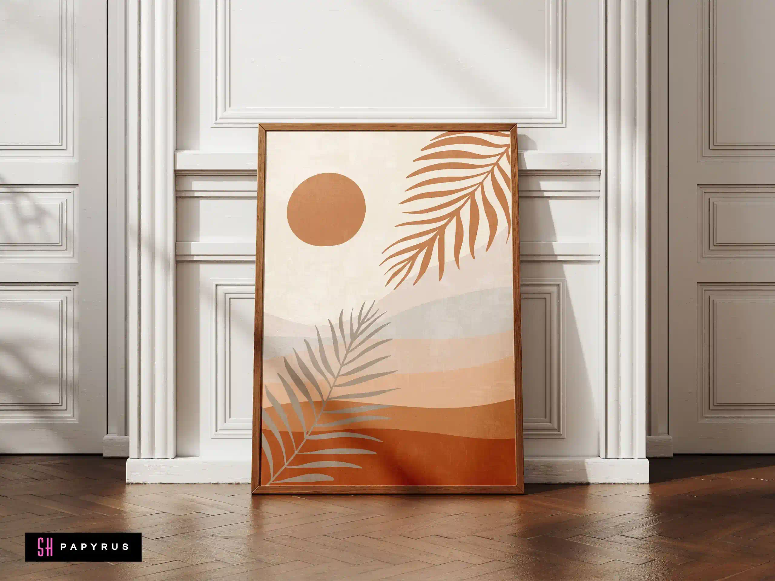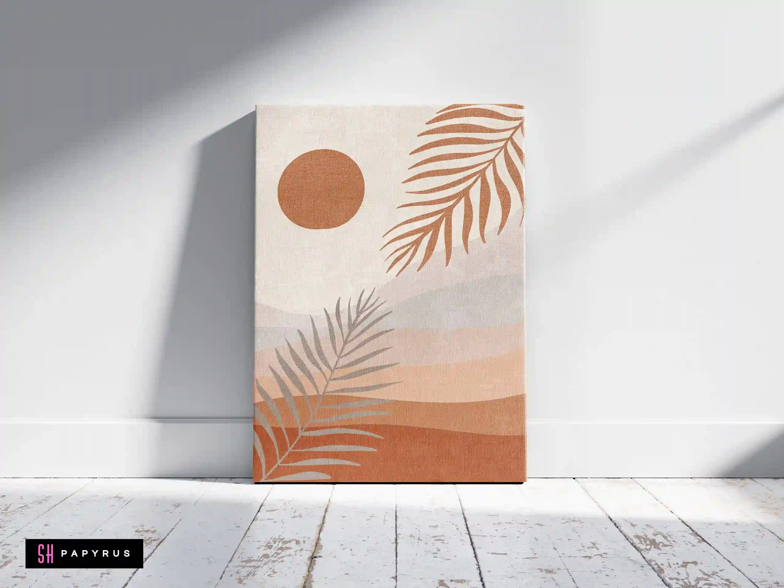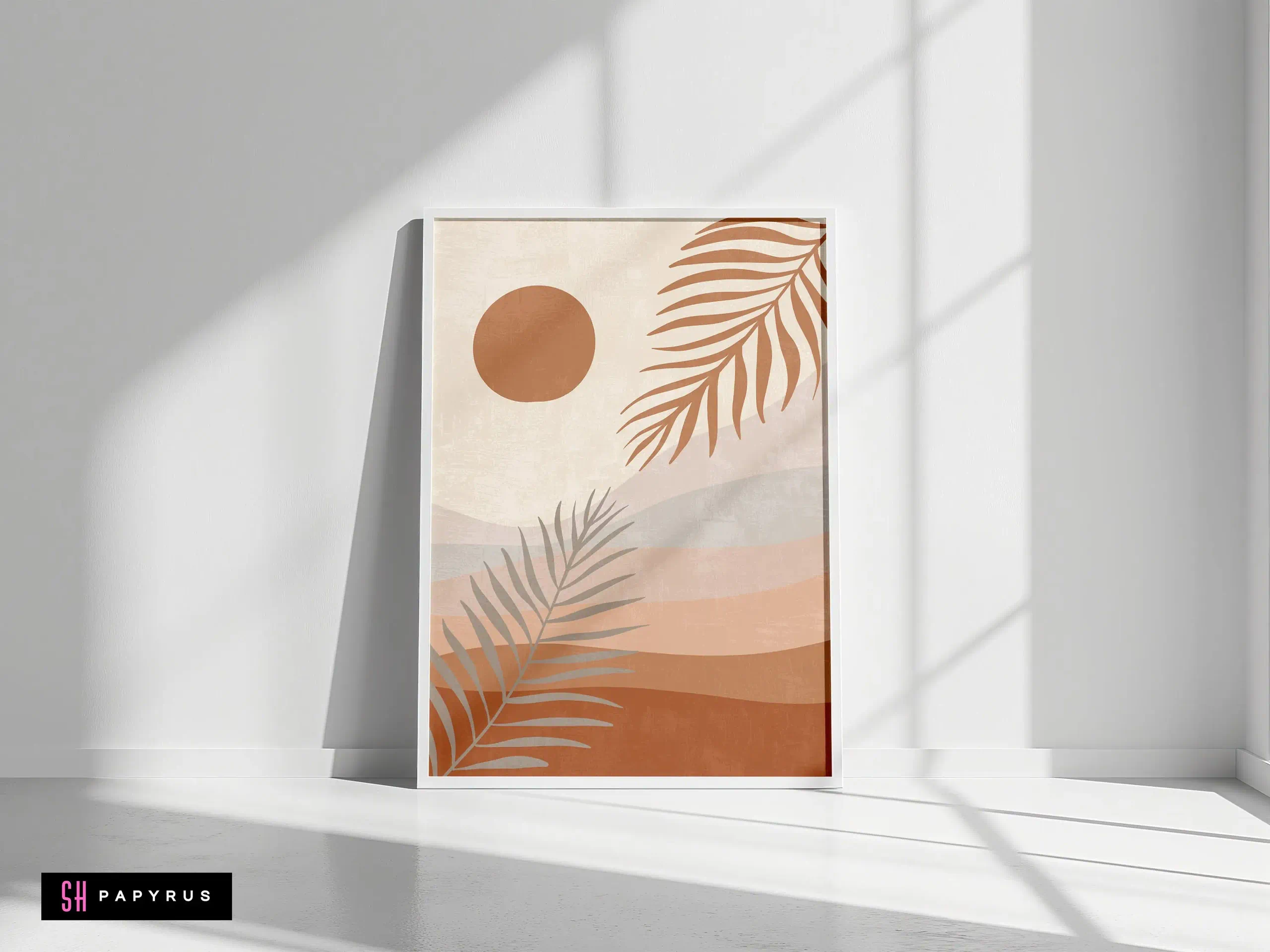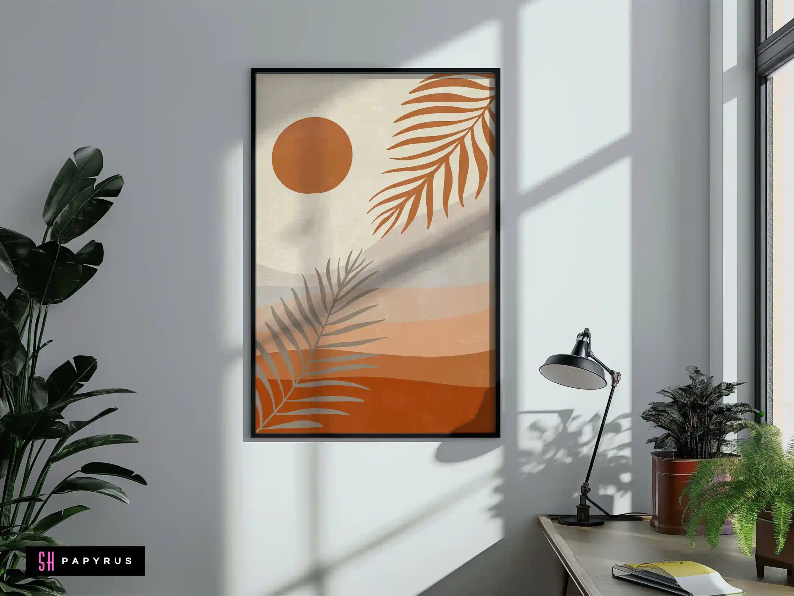 Warm up your room with a Textured Boho Desert Sun & Palm Leaves Print. A beautiful abstract landscape, it features a terracotta sun over layered hills in desert tones, with delicate palm leaves. The subtle texture on the artwork adds a lovely rustic, vintage, and artisanal feel. This print is a perfect way to bring a warm, adventurous, and tranquil vibe to your wall. It’s ideal for a boho, Southwestern, or eclectic-style living room or bedroom. The earthy colors are grounding and cozy. This art is available as a Digital File download, a premium Giclee Poster on matte paper, a durable Canvas, or a Framed Print in either a sleek metal or rustic wood option. All physical prints are made with museum-quality, fade-resistant materials.