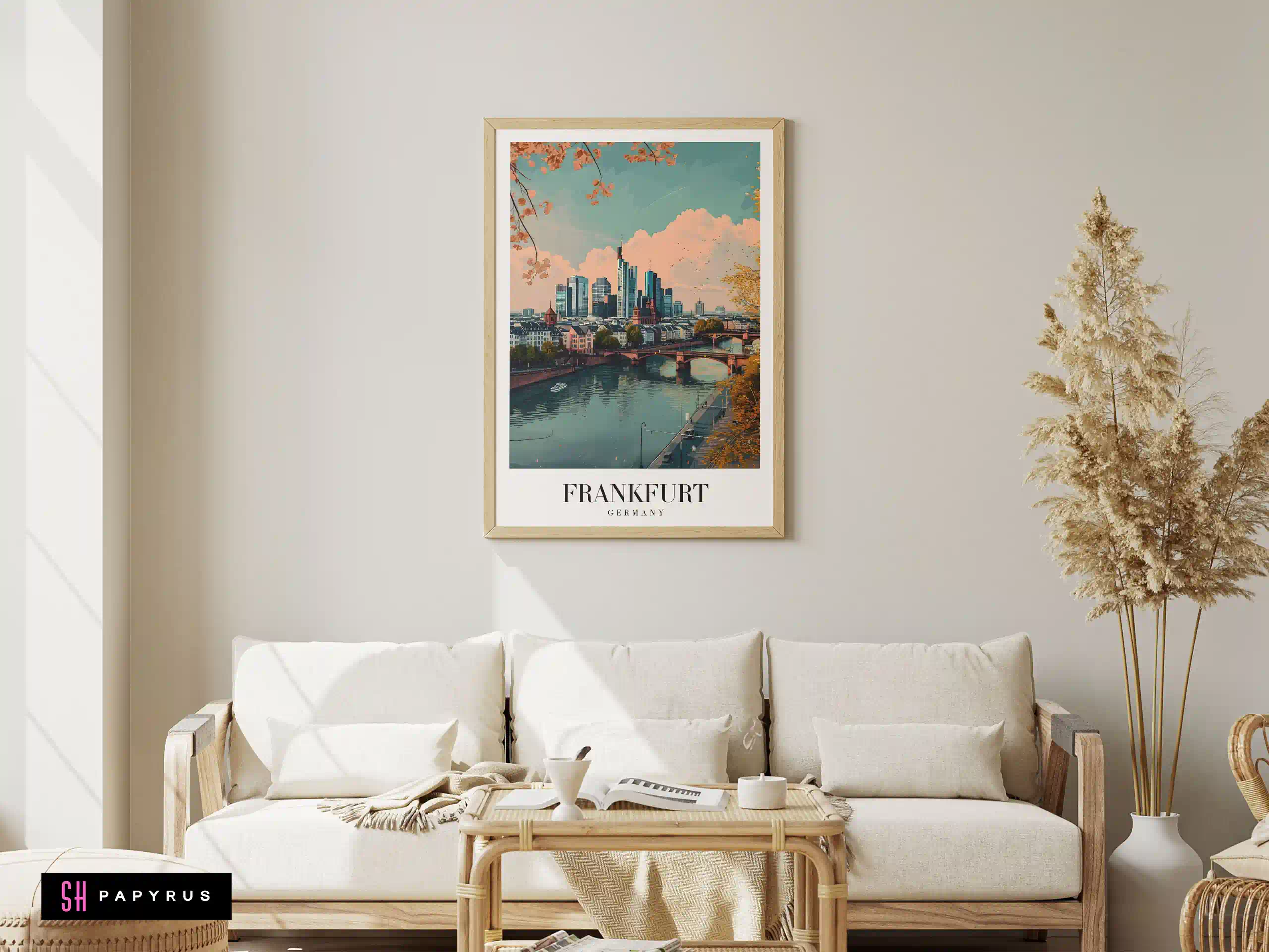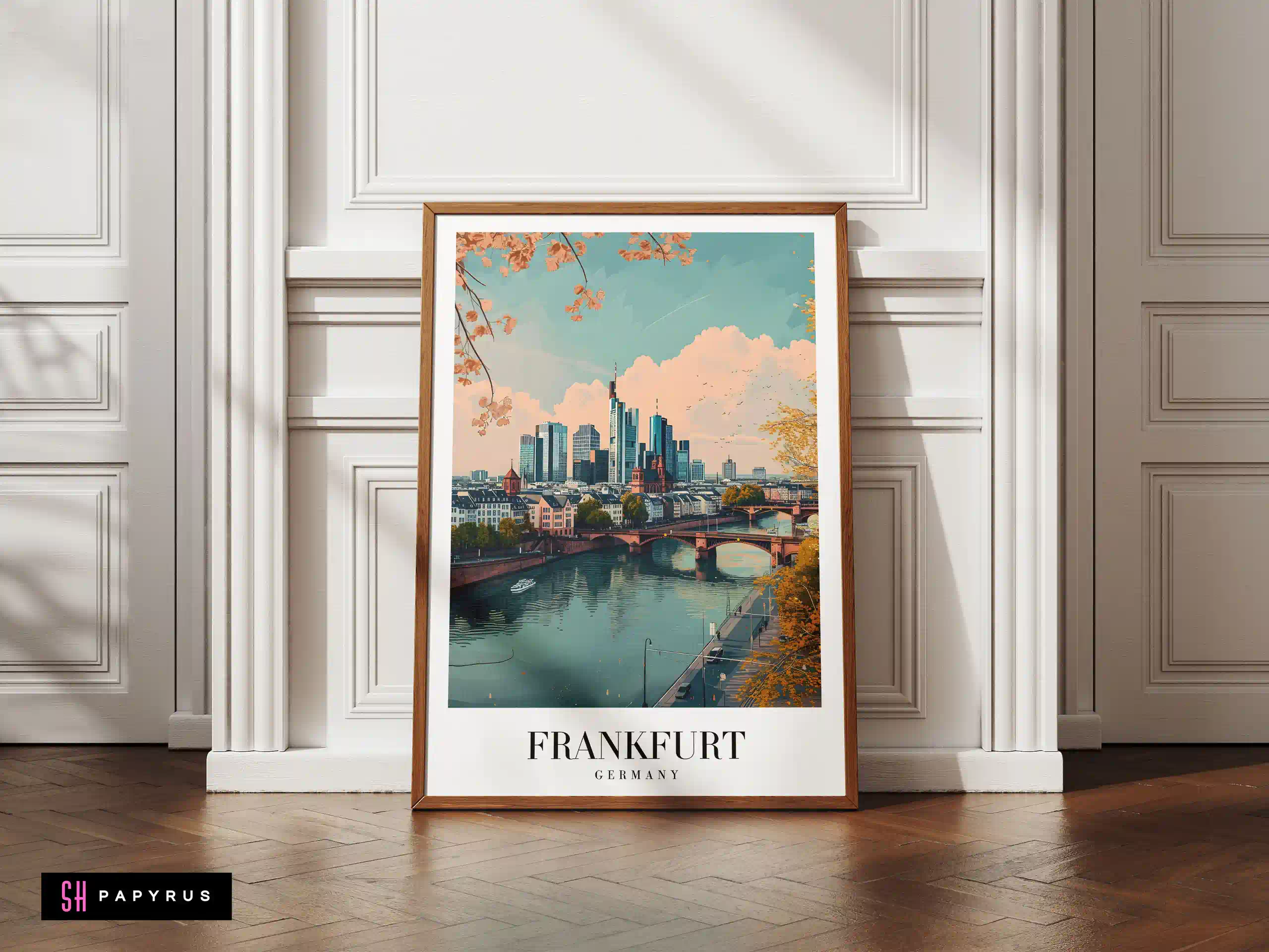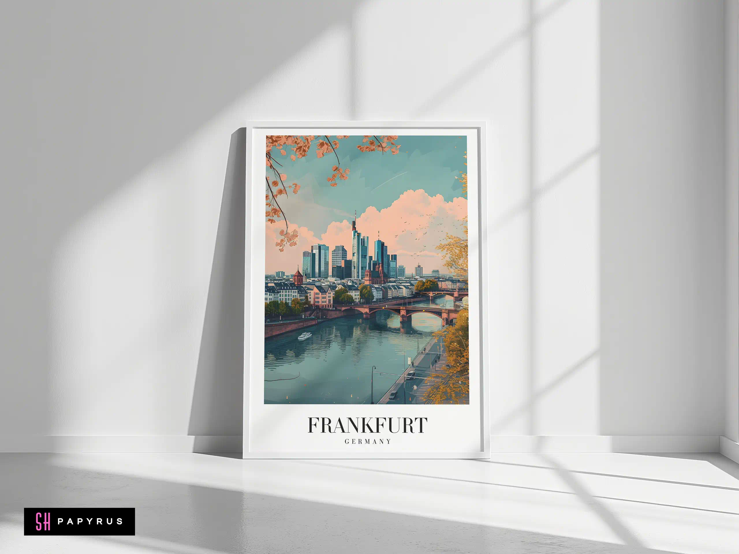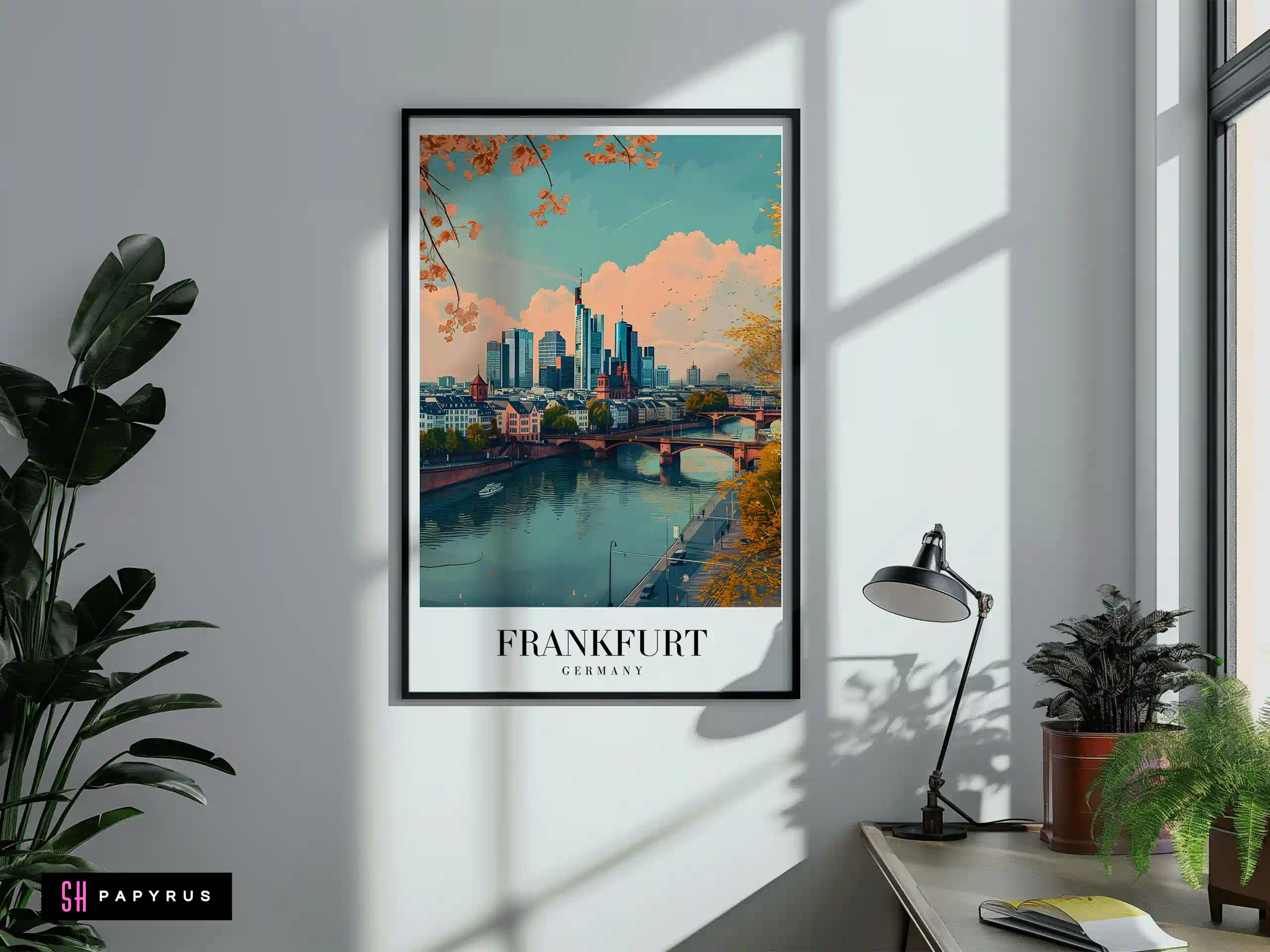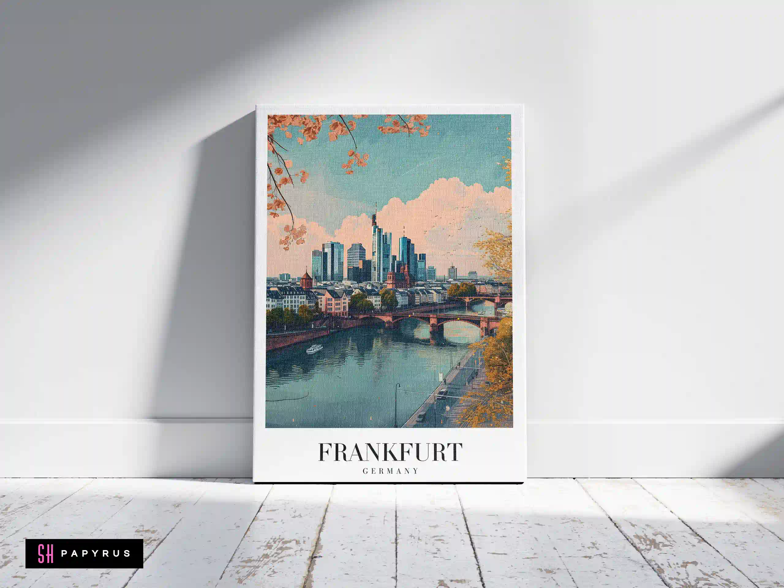 Capture the unique blend of old and new with a Beautiful Frankfurt Germany Skyline in Autumn Poster! This stunning, painterly illustration features the city’s modern, skyscraper-filled skyline rising above the Main River and its historic bridges. The scene is beautifully framed by golden, orange, and red autumn leaves, adding a warm, cozy, and seasonal touch. The artwork perfectly balances the cool, glass-and-steel architecture with the warmth of nature. This is a perfect, sophisticated piece for a modern living room, a home office, or as a gift for anyone who loves Germany. Your new piece is offered as a Digital File for instant download, a high-quality Giclee Poster (with rich, saturated colors), a gallery-wrapped Canvas, or a Framed Print in your choice of a metal or wood frame.