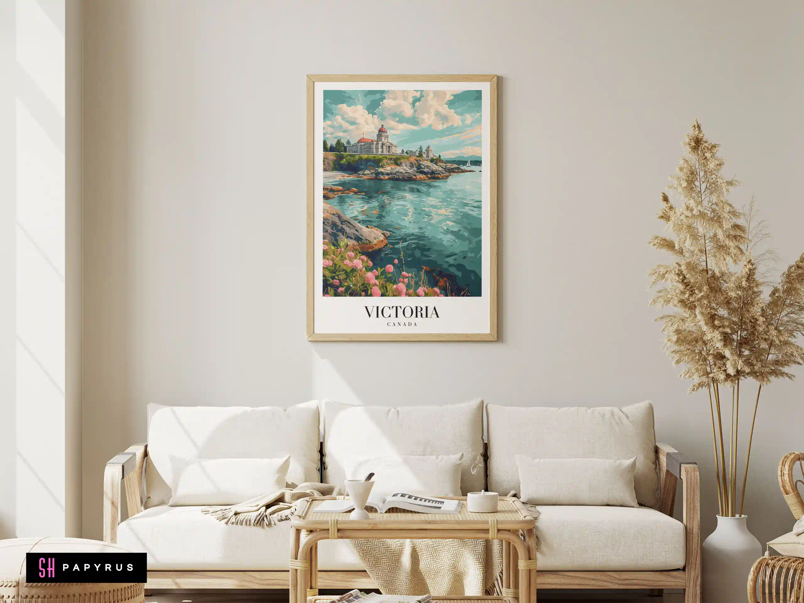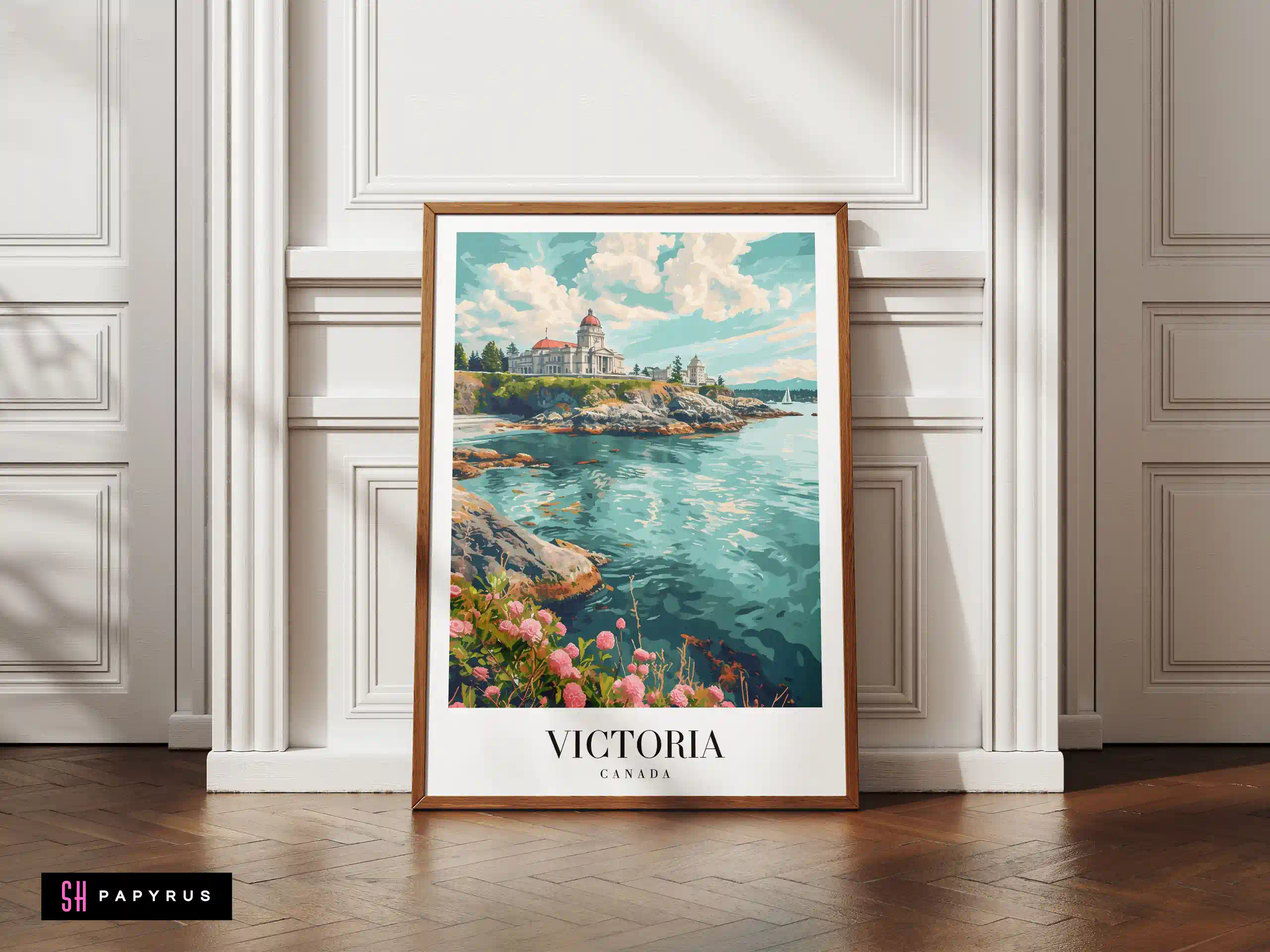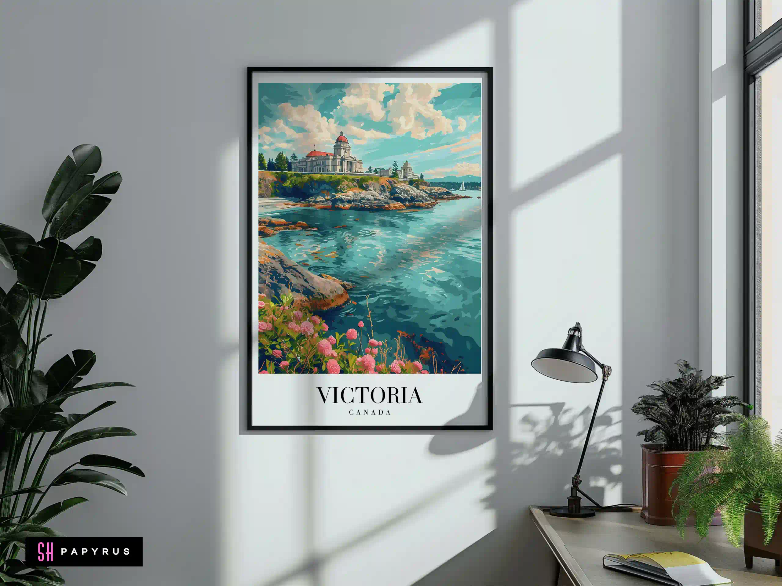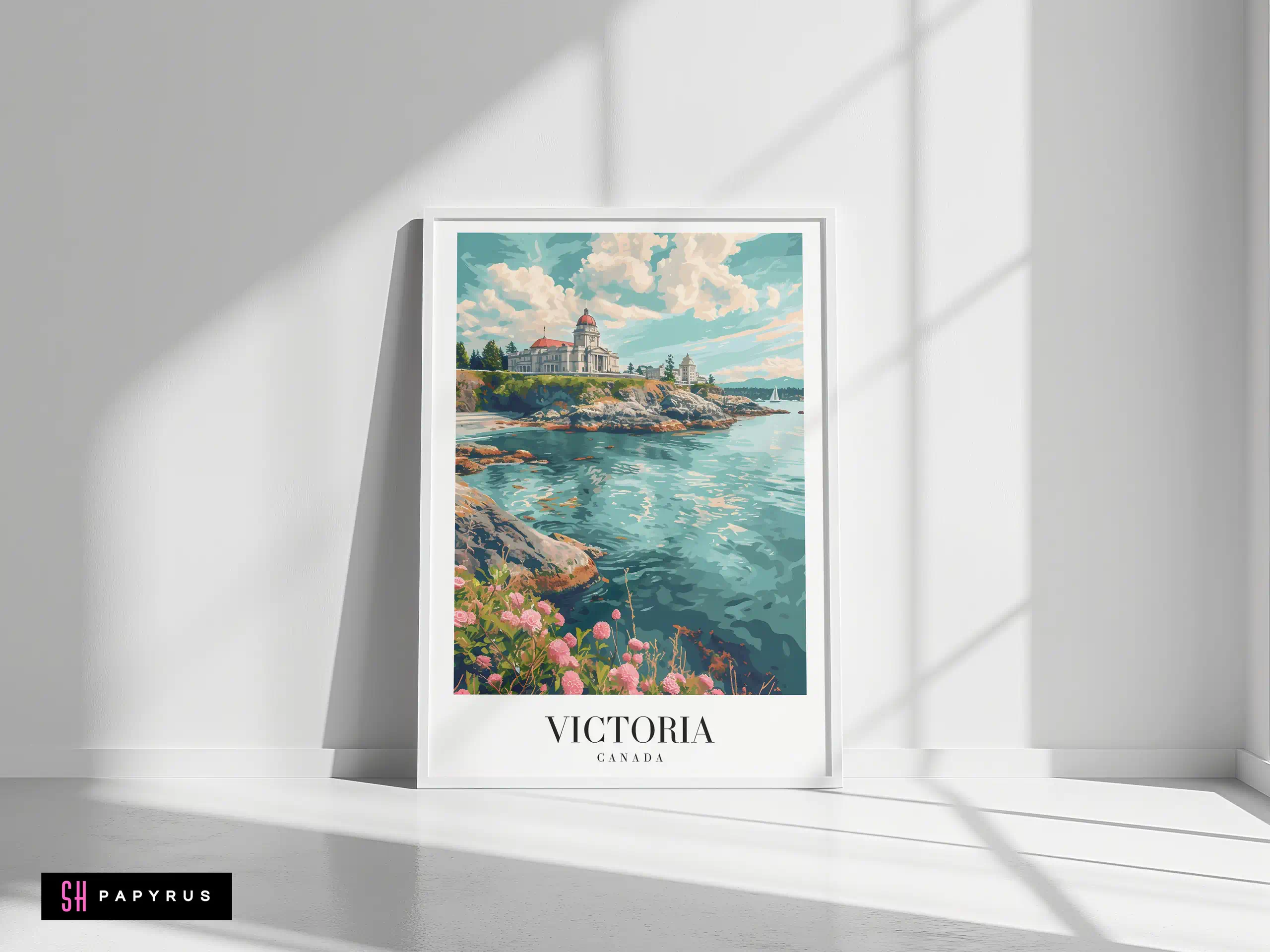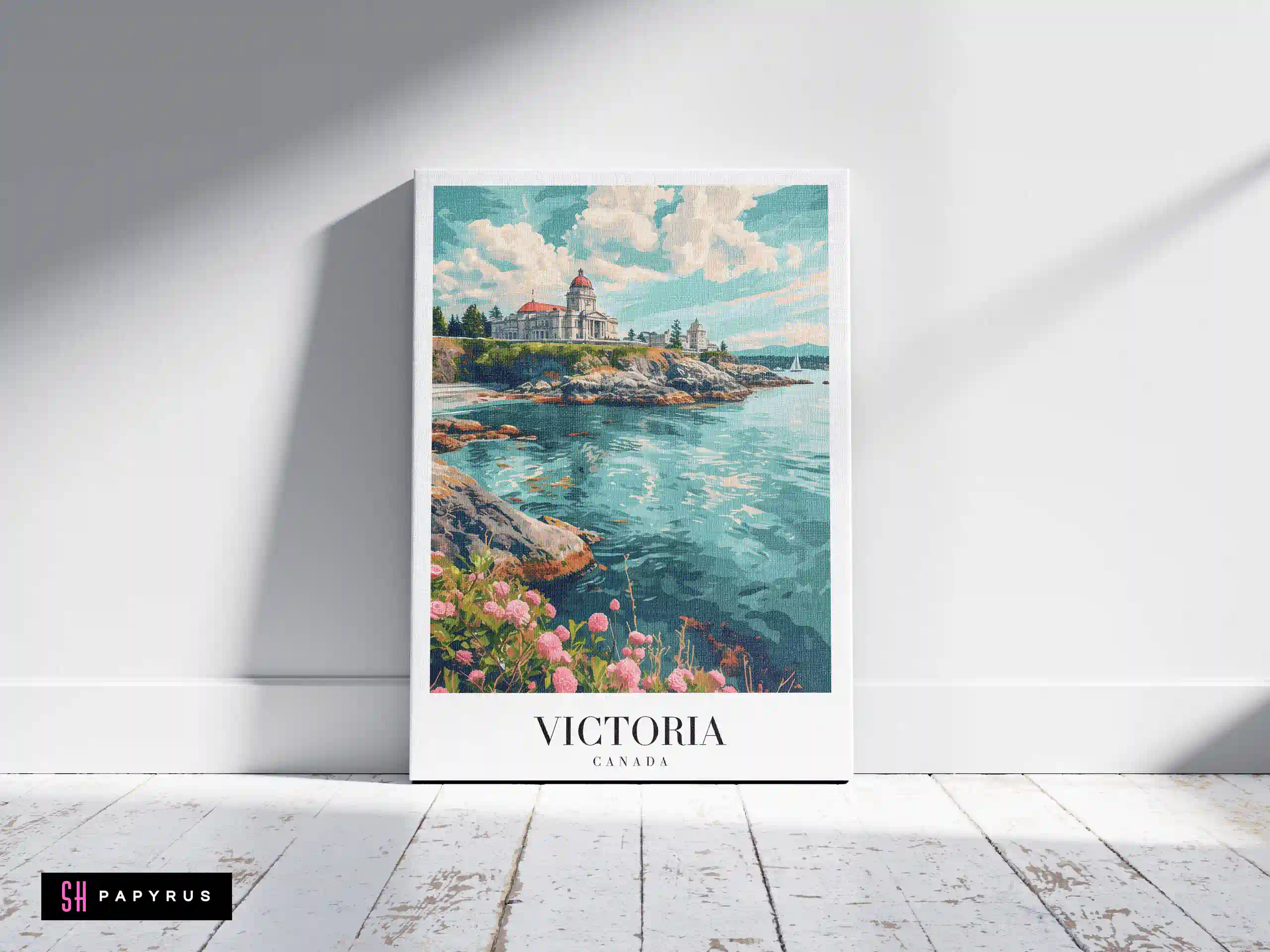 Bring home the coastal charm of British Columbia with a Beautiful Victoria Canada Inner Harbour Travel Poster! This stunning, painterly illustration captures a perfect, sunny day in Victoria. The artwork features a view of the rocky coastline and the sparkling, turquoise water of the Inner Harbour, with the iconic, domed Legislative Assembly Building in the distance. In the foreground, vibrant pink flowers add a beautiful pop of color, creating a perfect blend of natural and architectural beauty. This print is an ideal, peaceful piece for a living room, a bedroom, or a coastal-themed bathroom, adding a touch of serene, West Coast elegance. Your new art is available as an instant Digital File, a premium Giclee Poster (on thick, archival matte paper), a gallery-wrapped Canvas, or a professionally Framed Print in a metal or wood frame, shipped ready to hang.