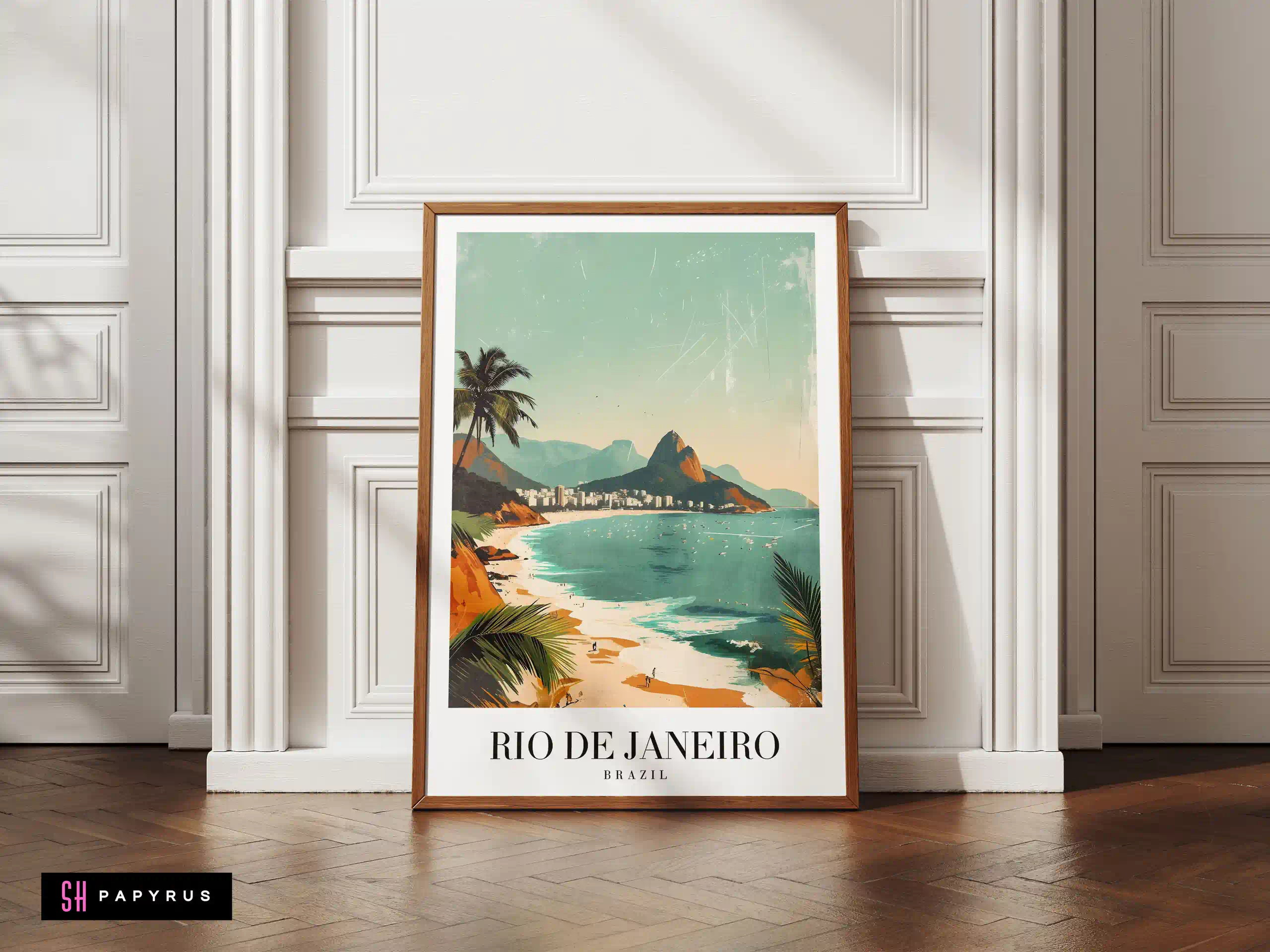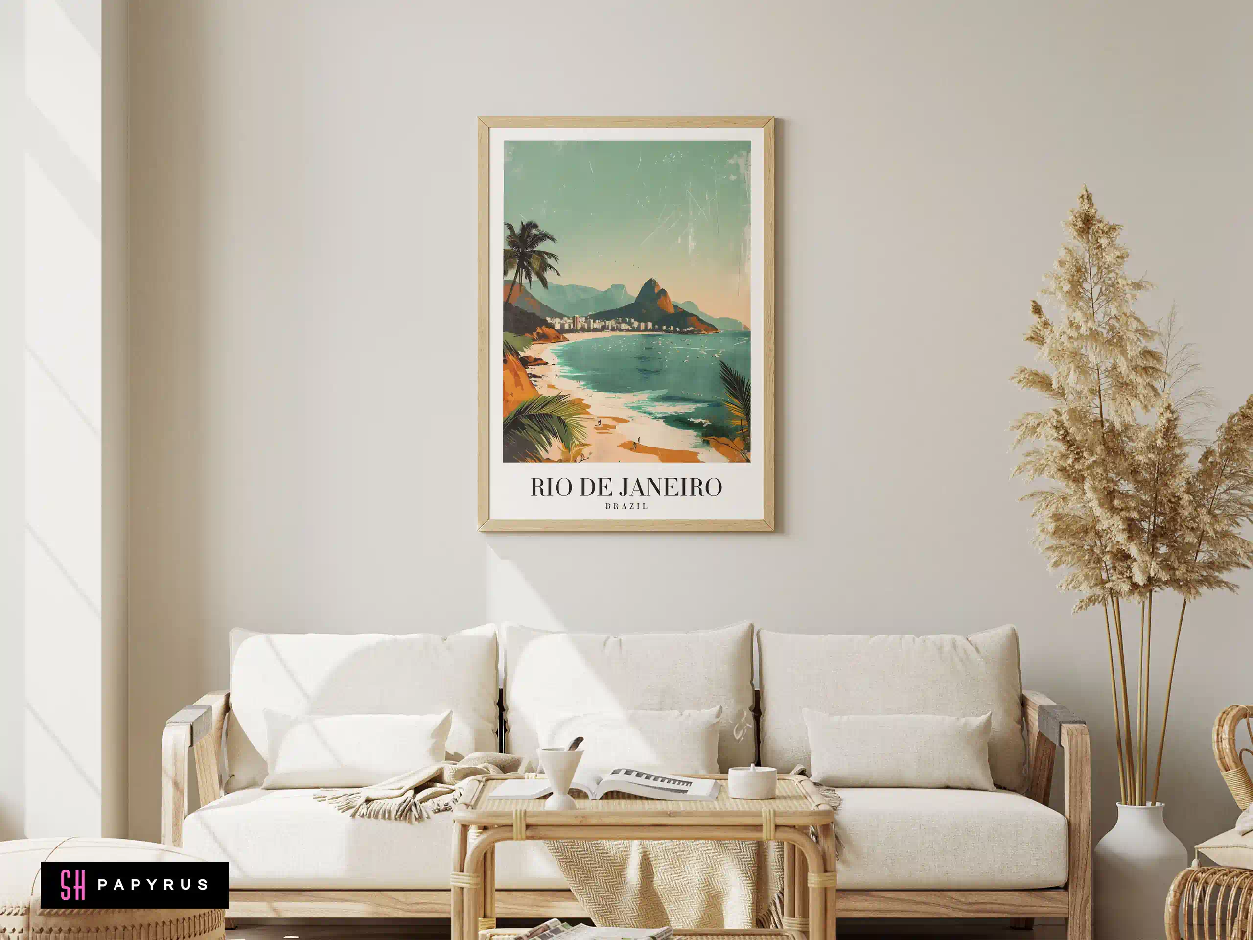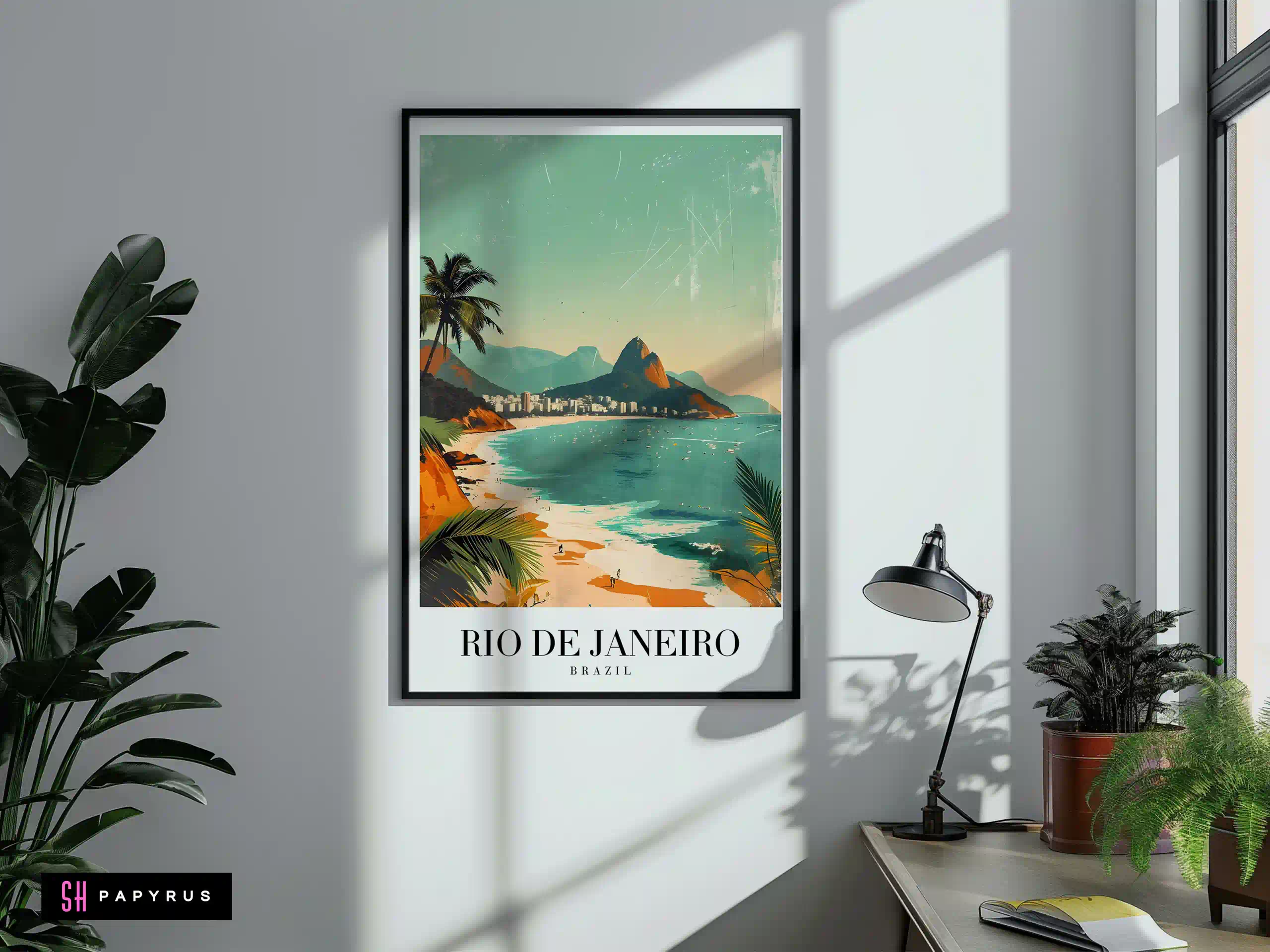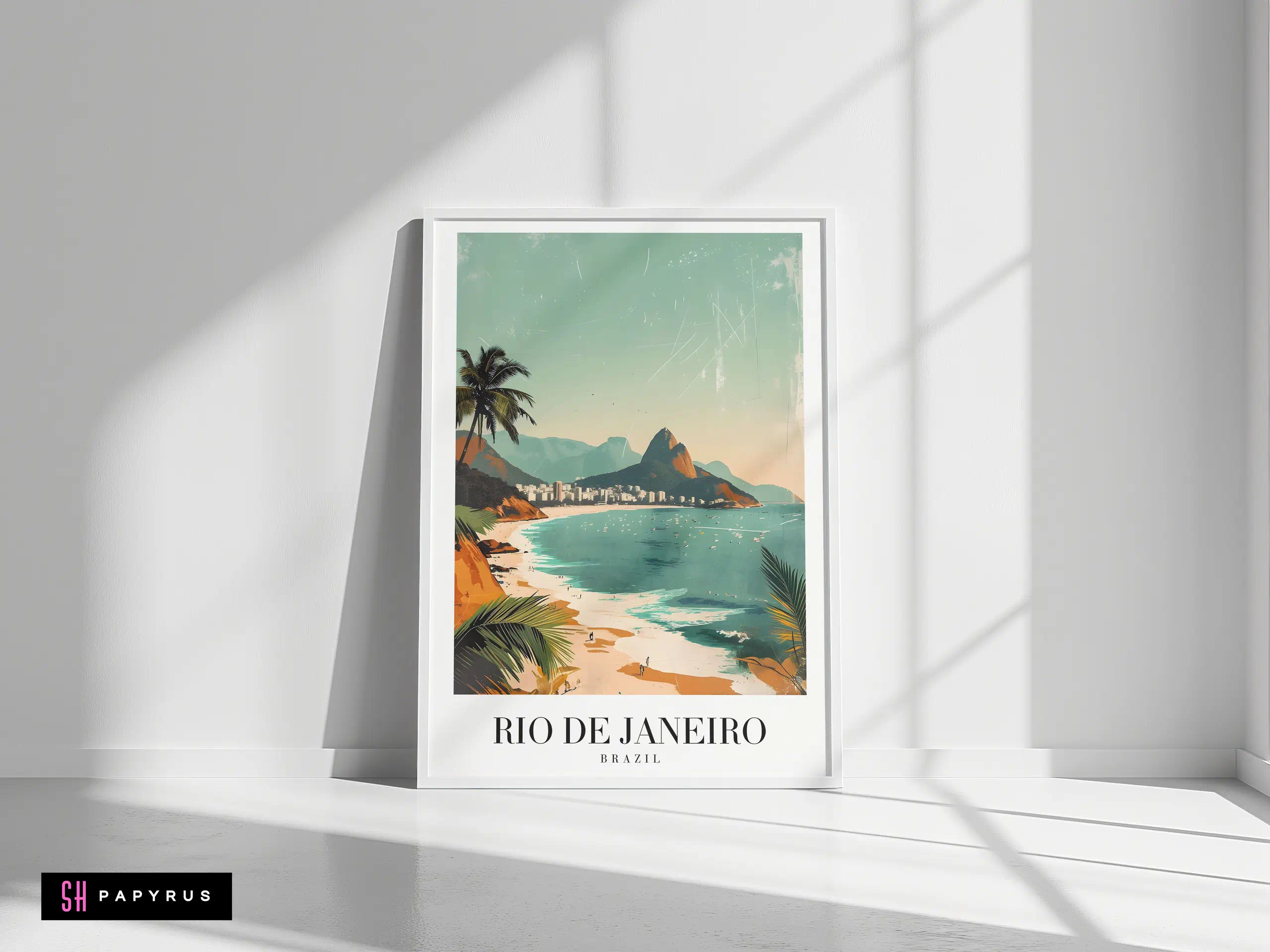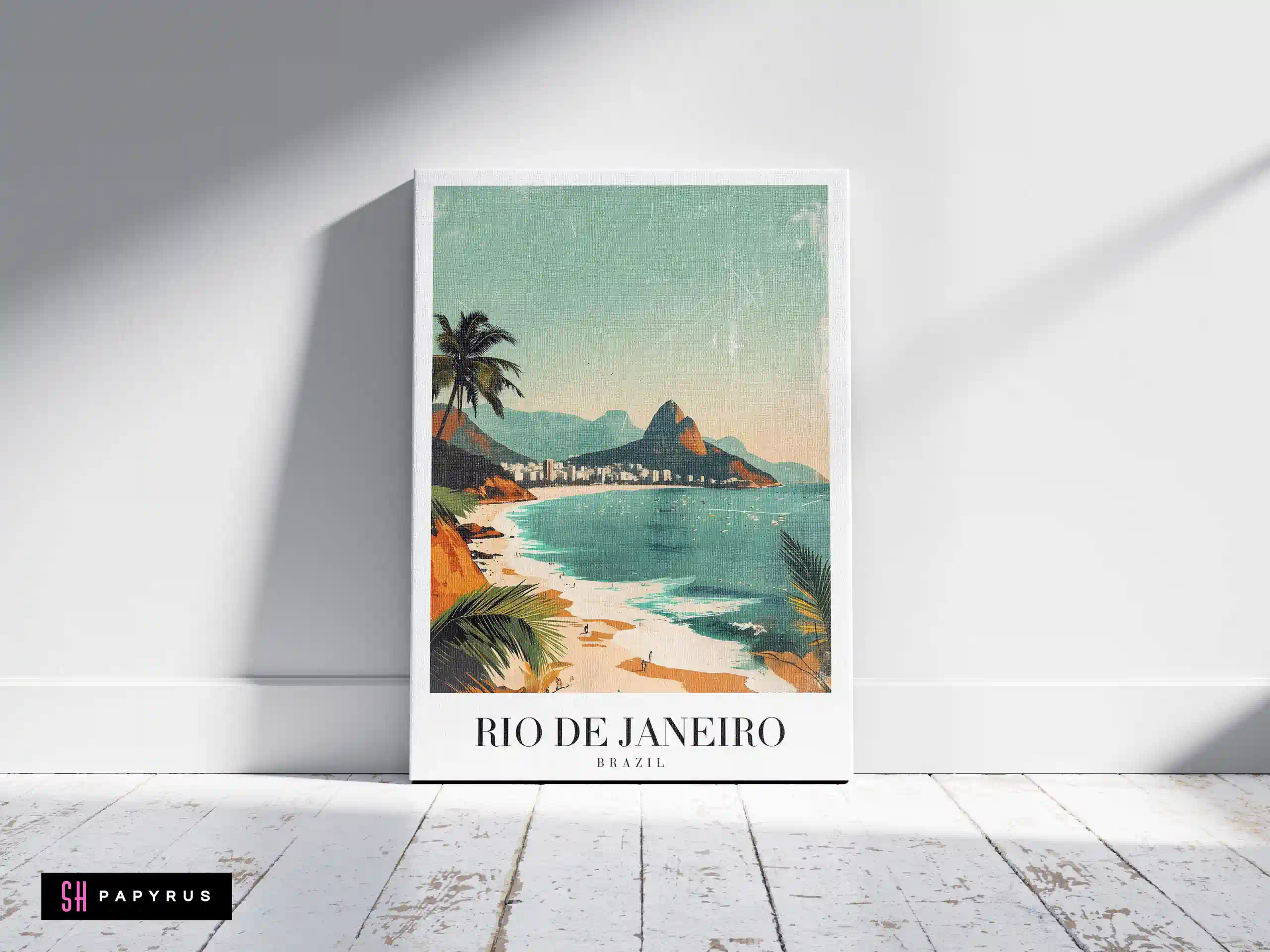Bring home the iconic, sun-drenched vibe of Rio with an Iconic Rio de Janeiro ‘Sugarloaf’ Vintage Travel Poster! This stunning, ‘retro film’ style print captures the world-famous view of Sugarloaf Mountain rising above the sparkling, teal-blue water. The sandy beach is dotted with people, and the scene is beautifully framed by lush palm tree fronds. The artwork has a beautiful, ‘vintage’ texture with subtle scratches and a teal-and-orange color grade, giving it a nostalgic, timeless, and incredibly cool feel. It’s the perfect focal point for a boho or mid-century modern living room, a home bar, or a bedroom. Your new piece is offered as a Digital File for instant download, a high-quality Giclee Poster (with rich, saturated colors), a gallery-wrapped Canvas, or a Framed Print in your choice of a metal or wood frame.