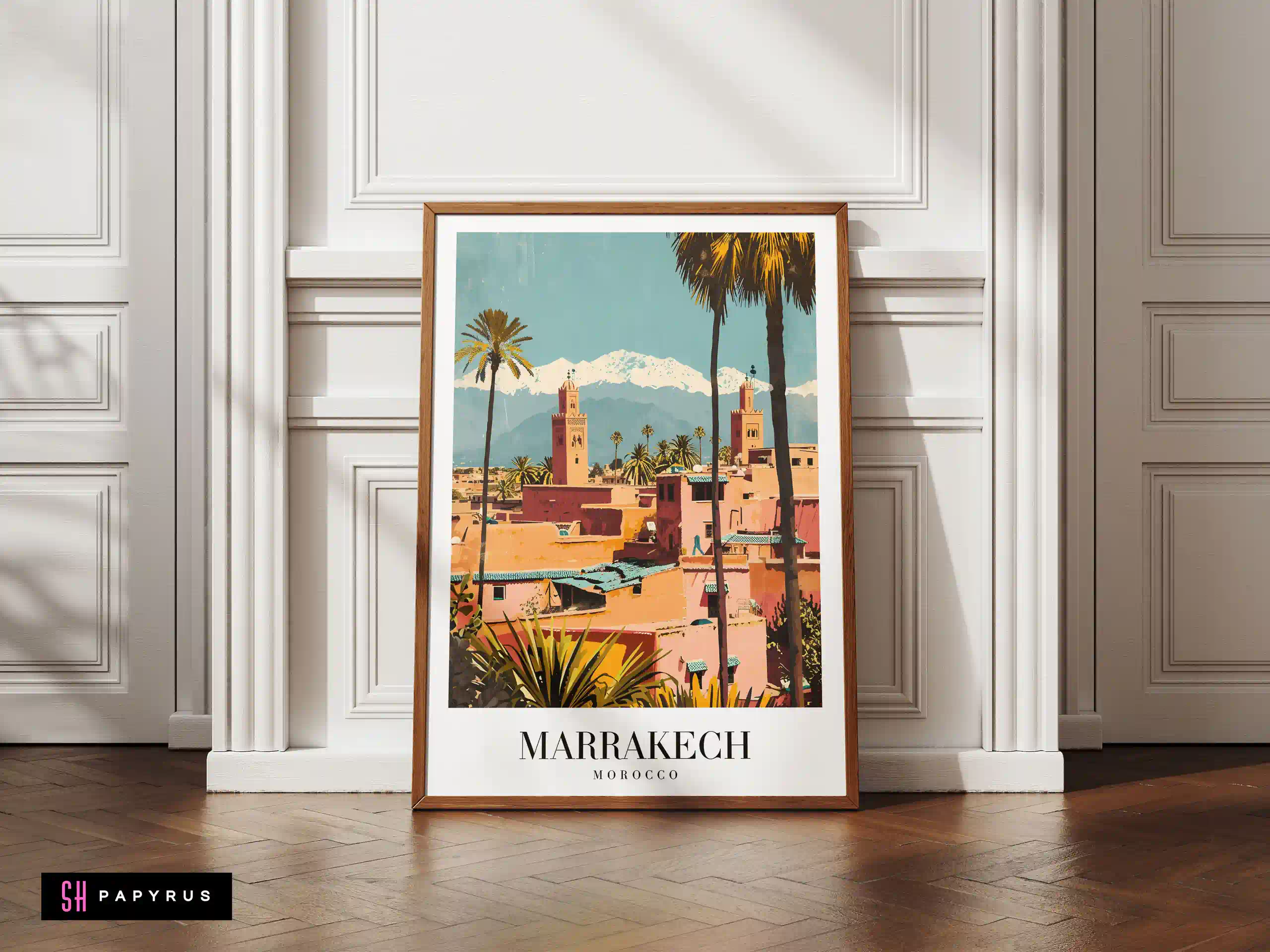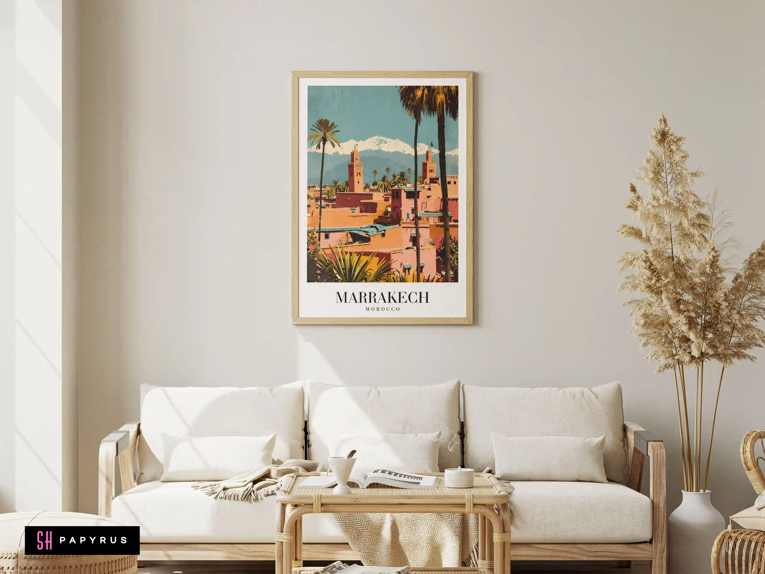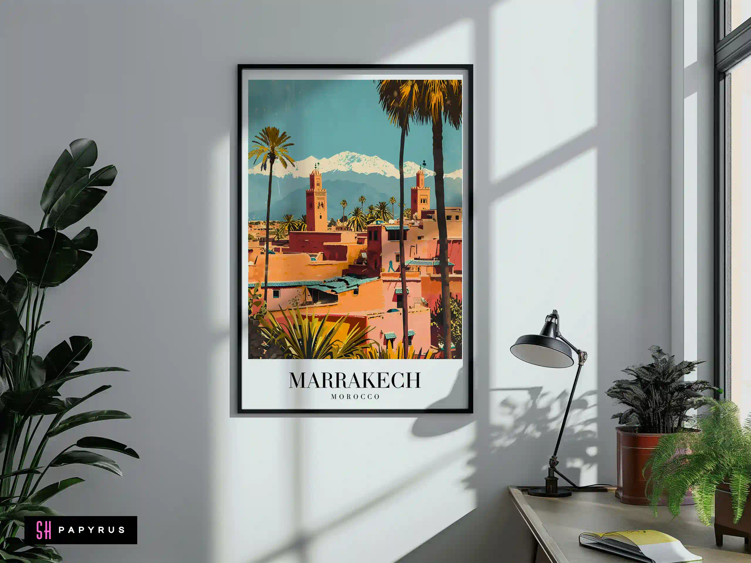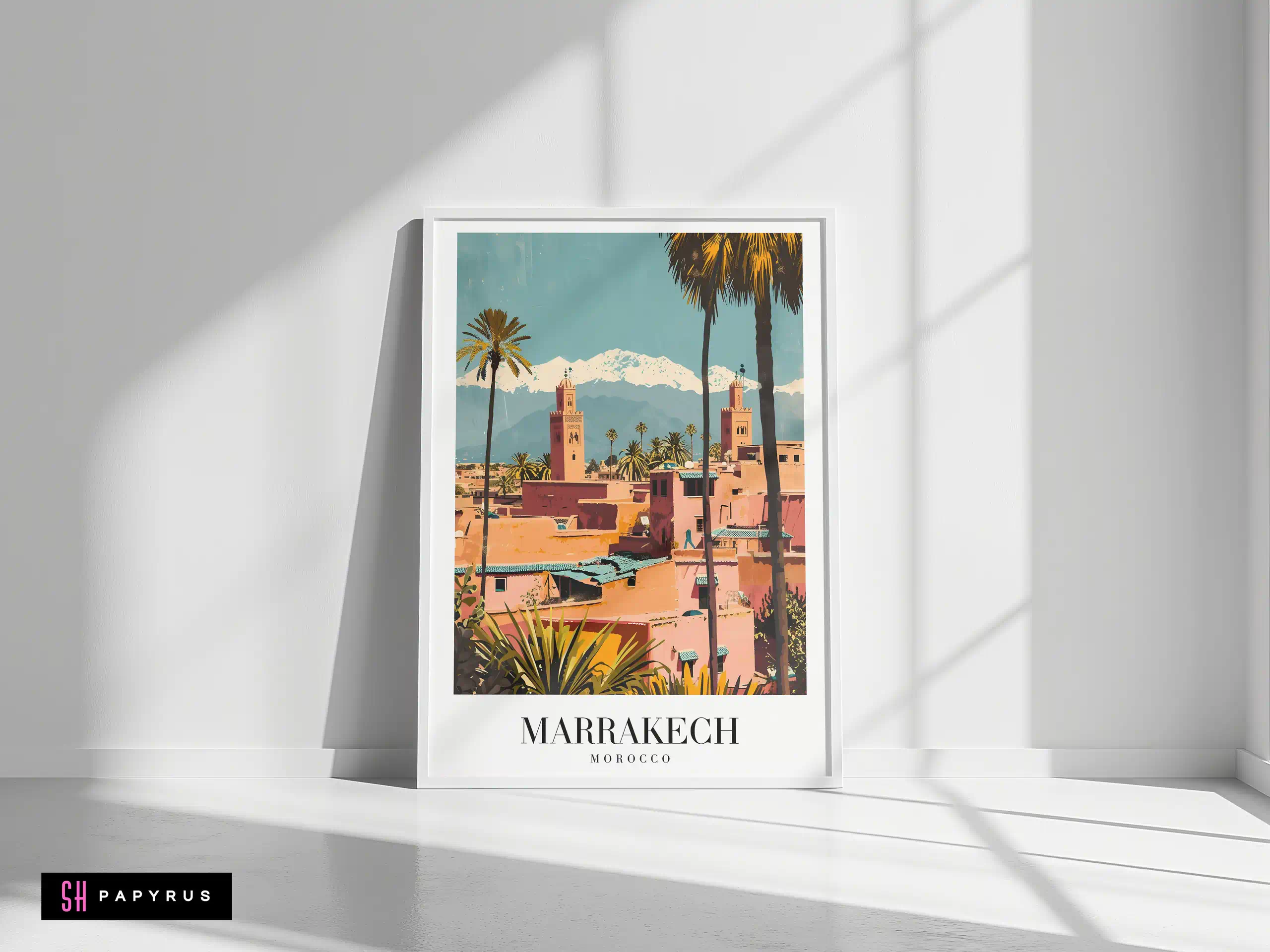 Capture the magic of Morocco with a Stunning Marrakech Morocco & Atlas Mountains Travel Poster! This breathtaking, painterly view features the pink, terracotta rooftops of the Medina (Old City), with the iconic minarets of the Koutoubia Mosque rising in the distance. The entire “Red City” is framed by lush palm trees and set against the majestic, snow-capped Atlas Mountains. The warm, golden light and the contrast between the hot desert city and the cool, snowy mountains create a truly adventurous and romantic feel. This print is a must-have for any lover of travel or ‘boho’ decor. It’s an ideal focal point for a living room, bedroom, or home office. Your new artwork is offered as a high-resolution Digital File, an archival Giclee Poster (on thick, museum-quality matte paper), a ready-to-hang Canvas, or a complete Framed Print, professionally mounted in your choice of a metal or wood frame.