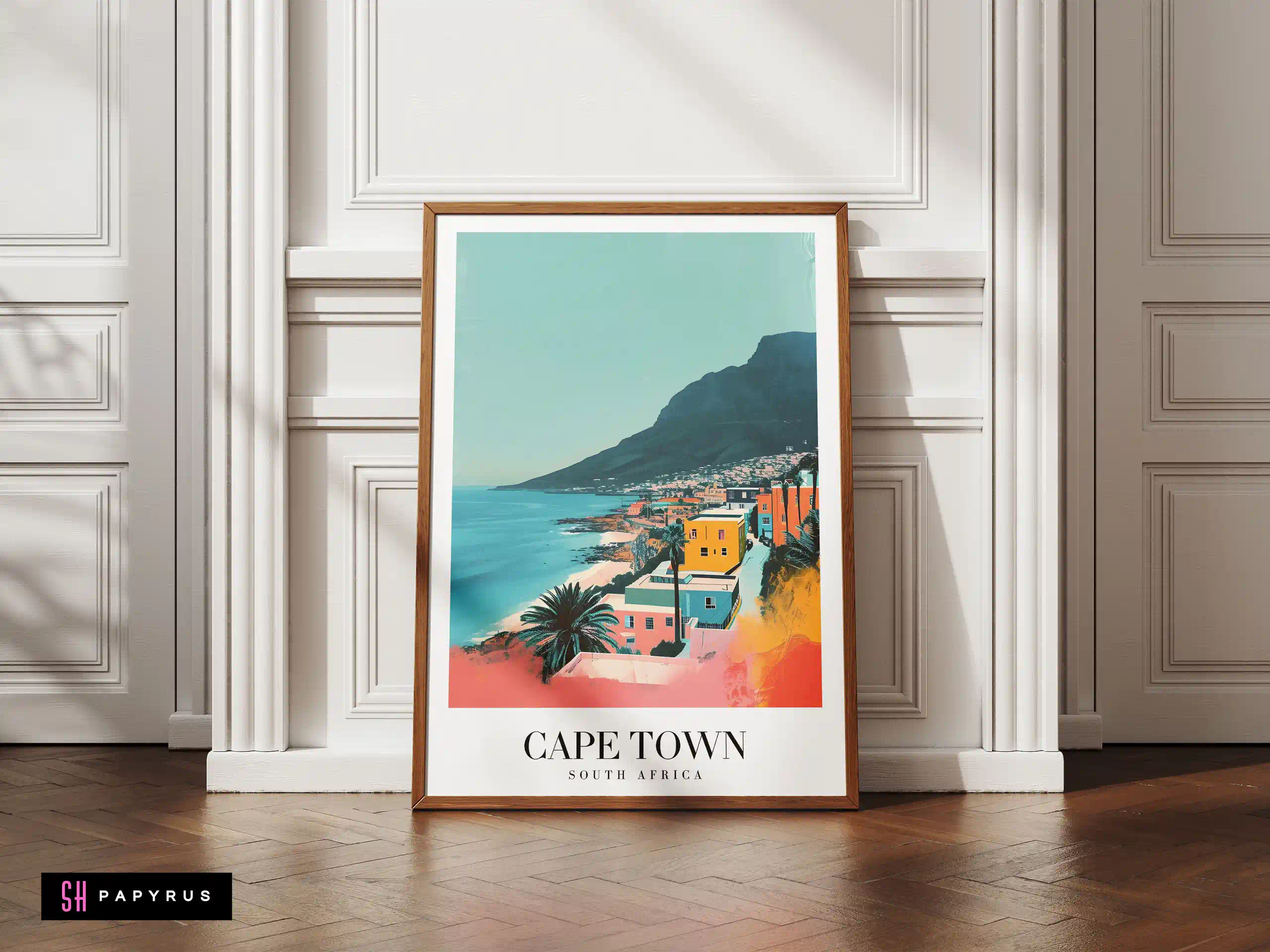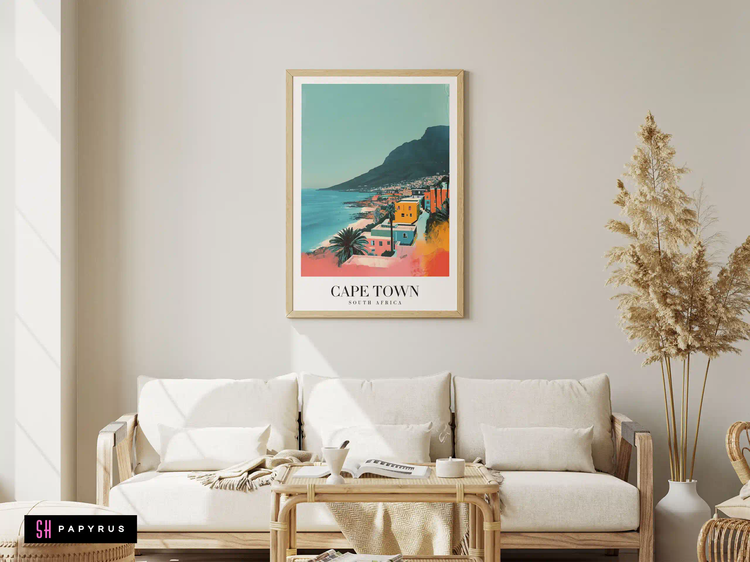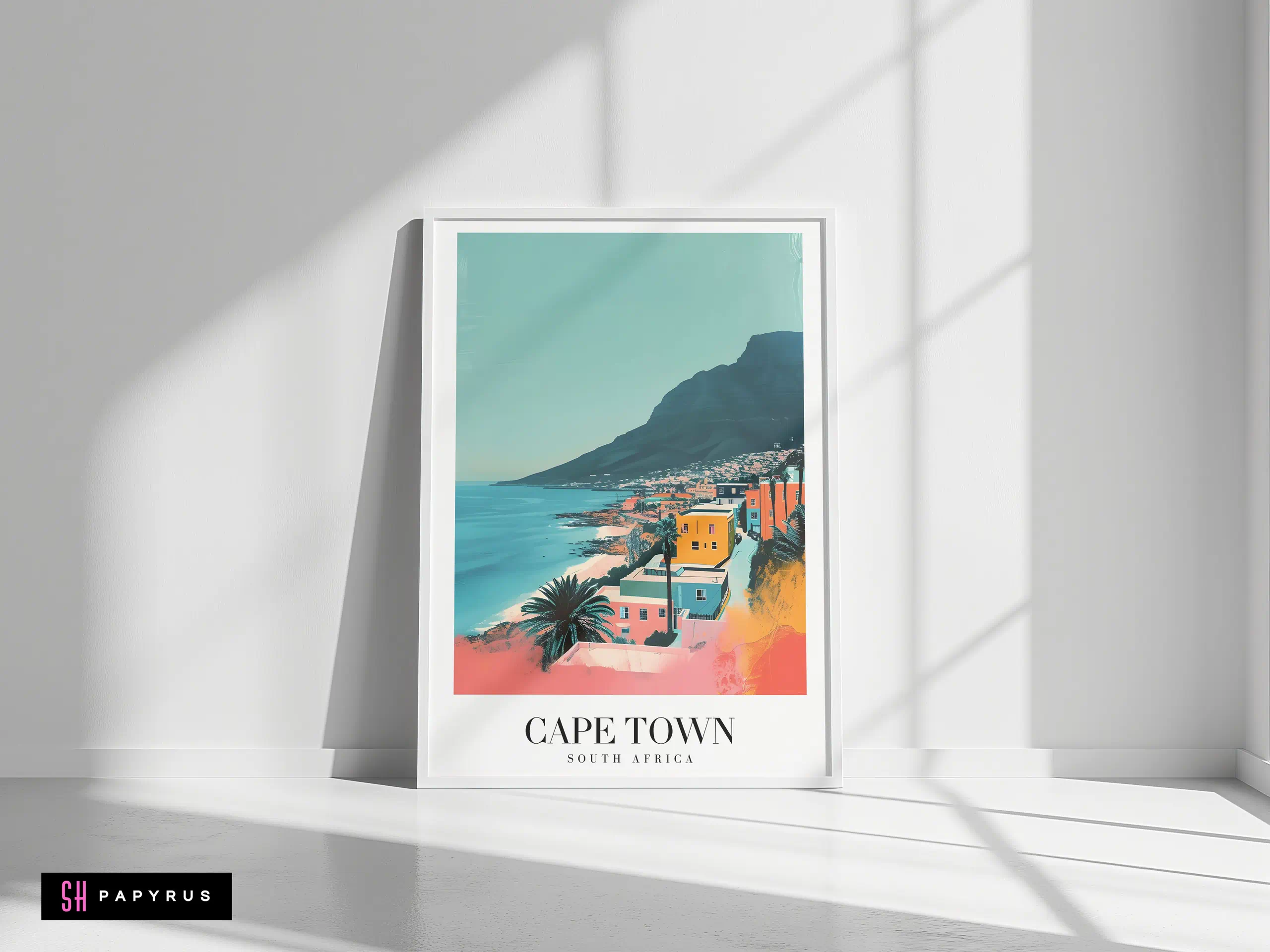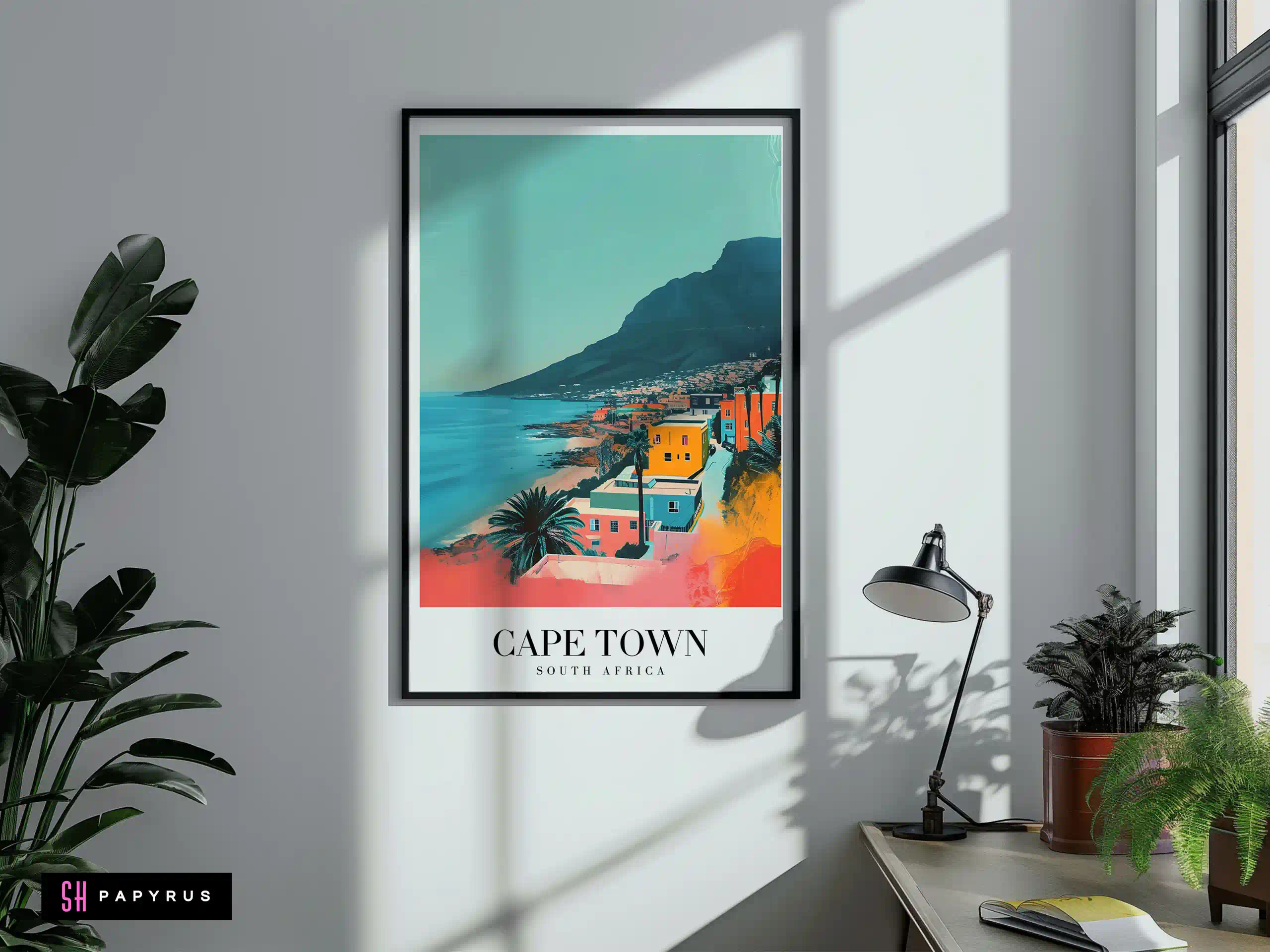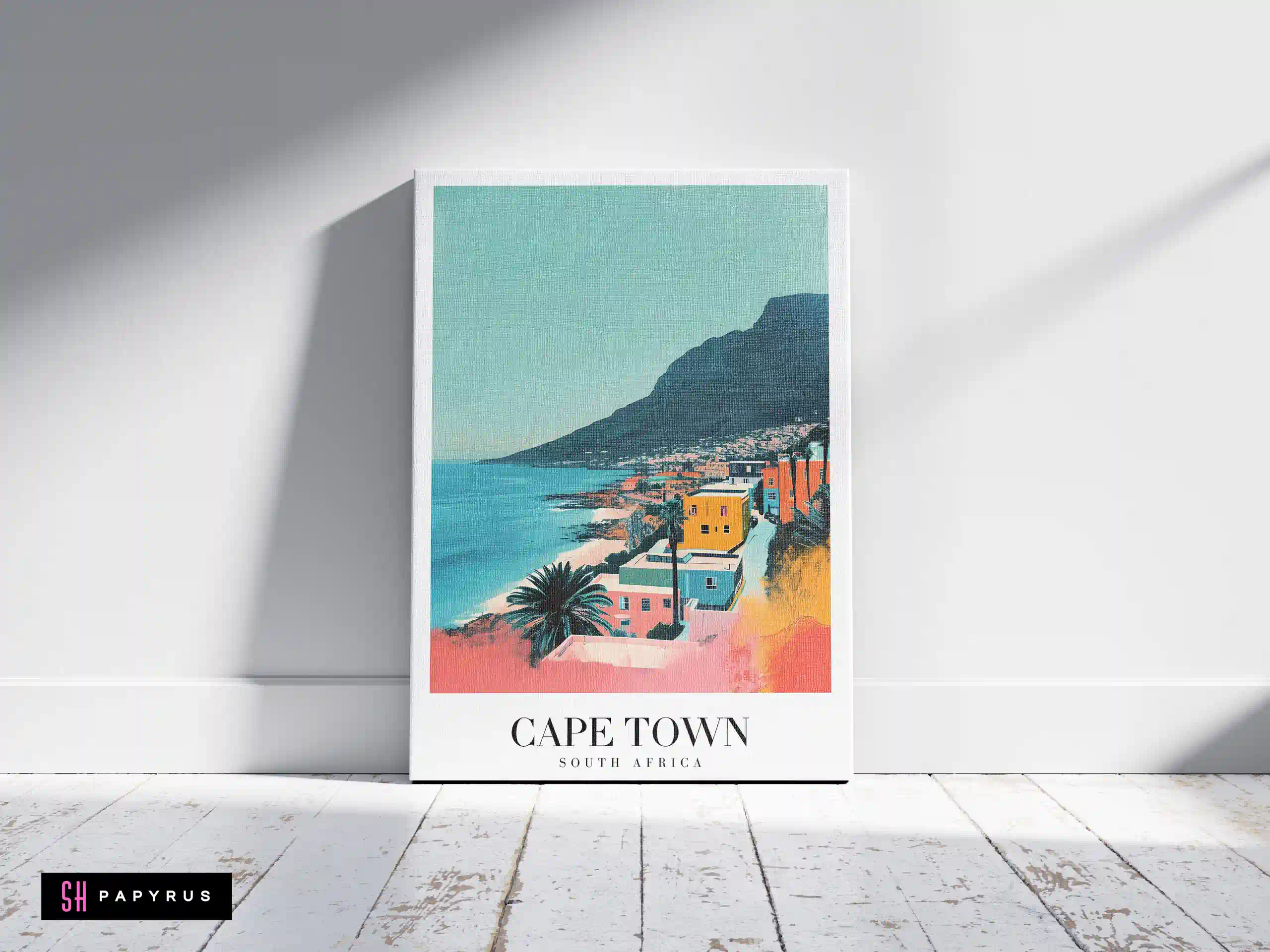Capture the breathtaking beauty of Cape Town with a Vibrant Cape Town South Africa ‘Table Mountain’ Poster! This stunning, stylized illustration features the majestic Table Mountain looming over the colorful, coastal neighborhoods and the sparkling, blue Atlantic Ocean. The artwork uses a bold, modern color palette, with vibrant pinks, oranges, and teals that give it a fresh, retro, and ‘pop art’ feel. It’s a perfect, stylish piece for a living room, bedroom, or home office, adding a blast of sunny, coastal, and adventurous energy. The elegant “CAPE TOWN SOUTH AFRICA” typography at the bottom gives it a clean, gallery-quality finish. This art is available as an instant Digital File download, a premium Giclee Poster (on archival matte paper), a durable Canvas, or a Framed Print in either a sleek metal or rustic wood option, shipped ready to hang.